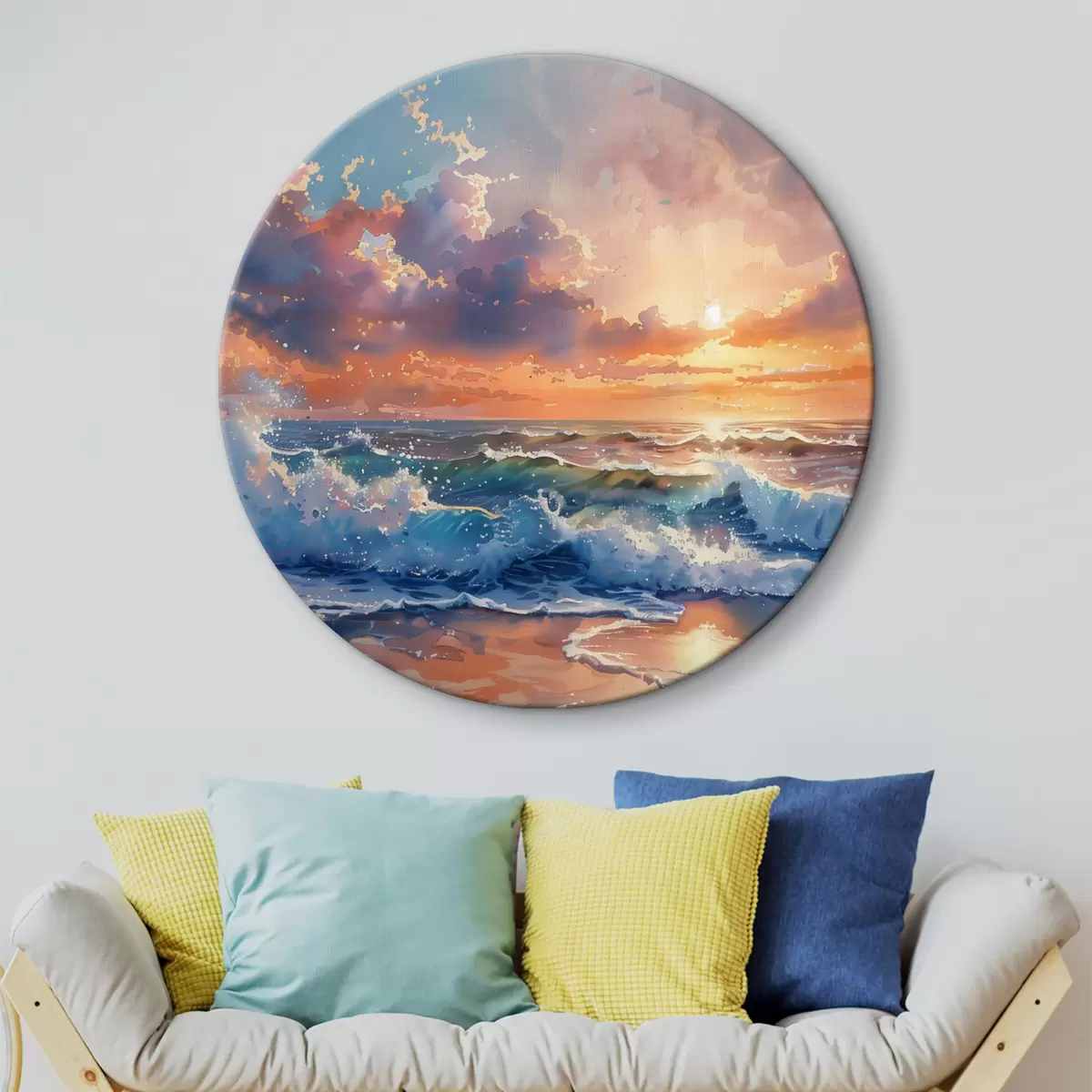 Ronde schilderijen Zonsondergang tegen de achtergrond van golven Nr r38474