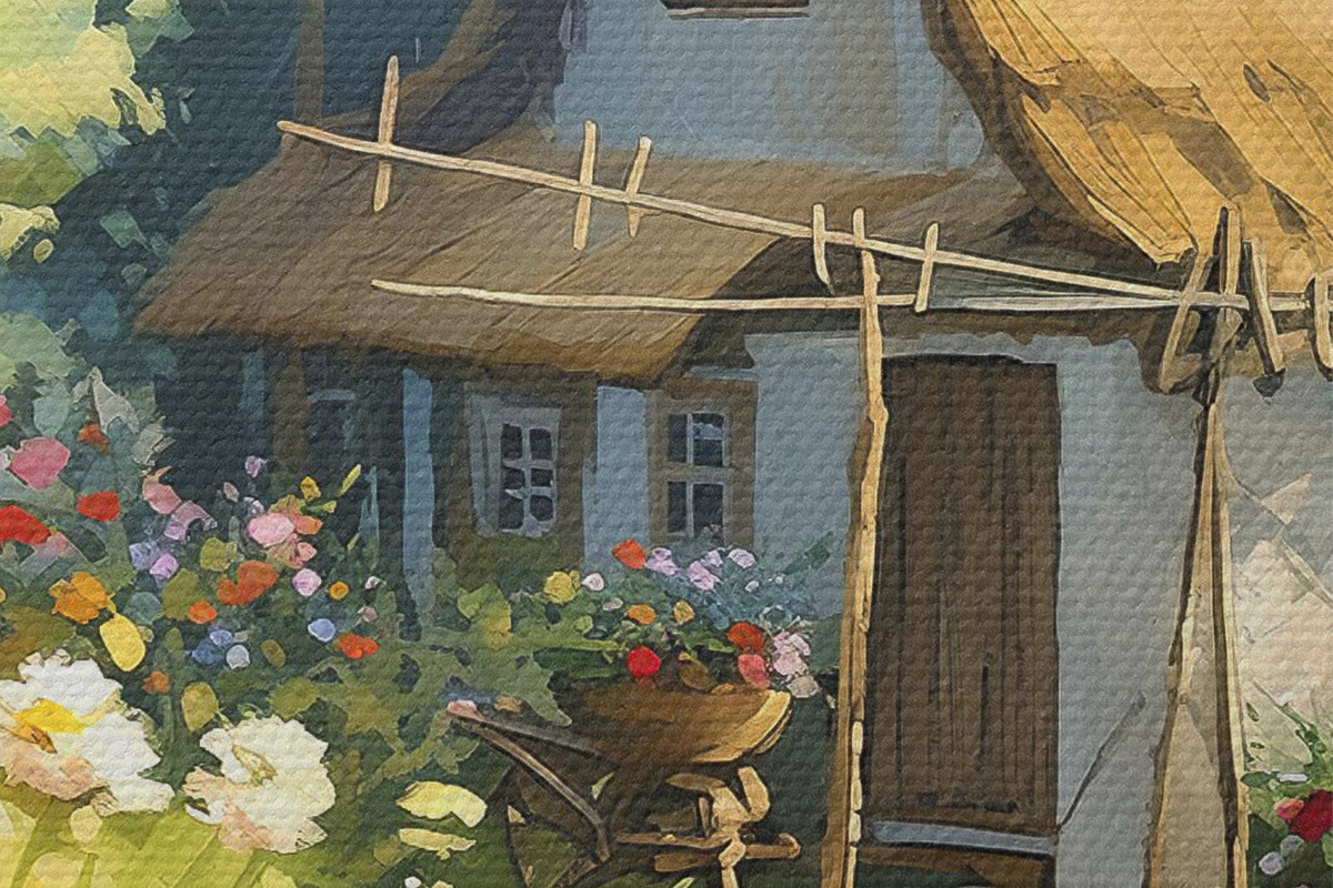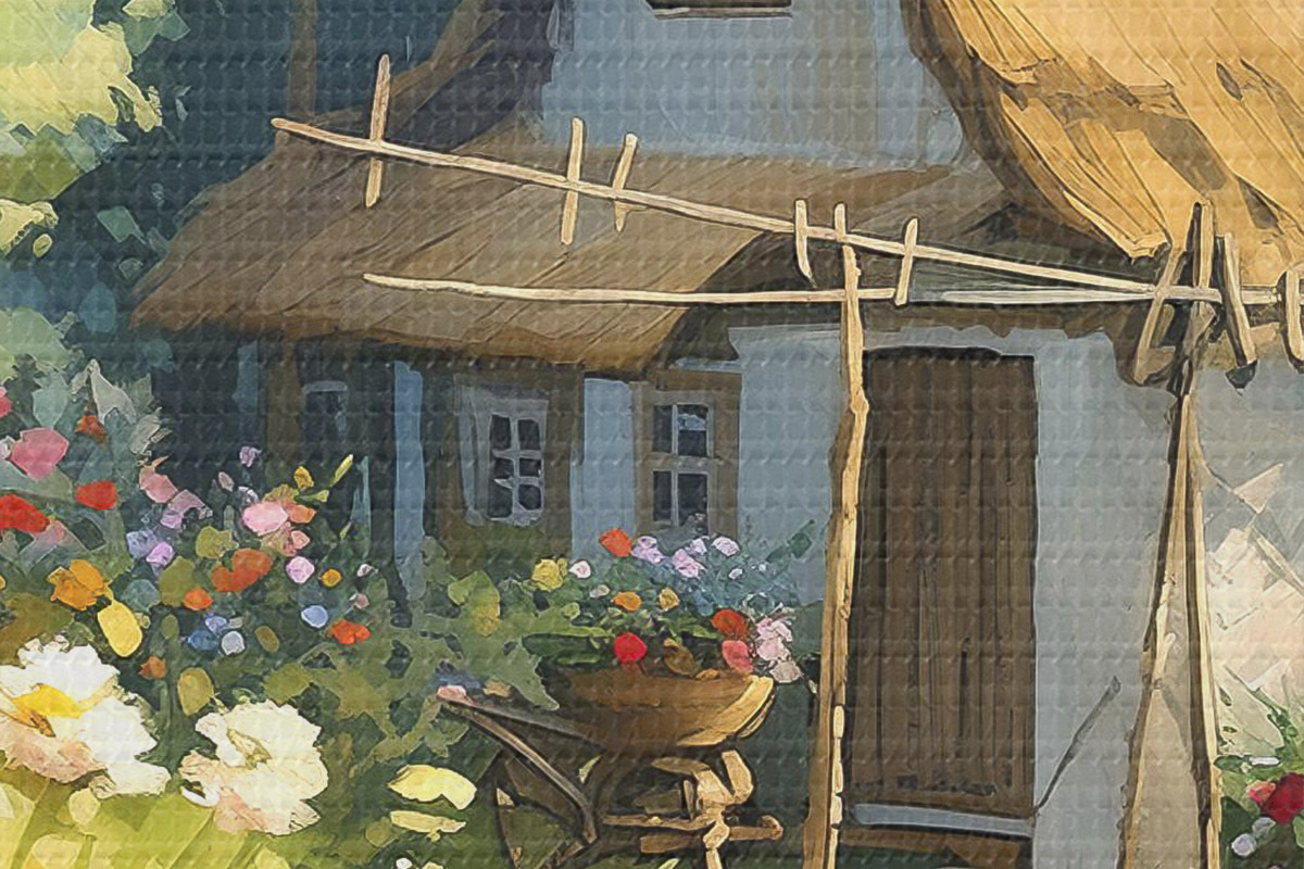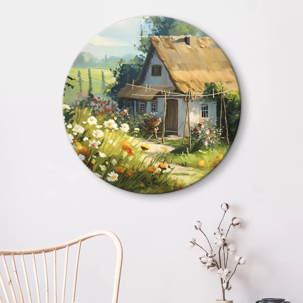Ronde schilderijen Dorpshuis met tuin, zomerbloemen, olieverf, penseelstreken, veld, rustieke stijl Nr r38491