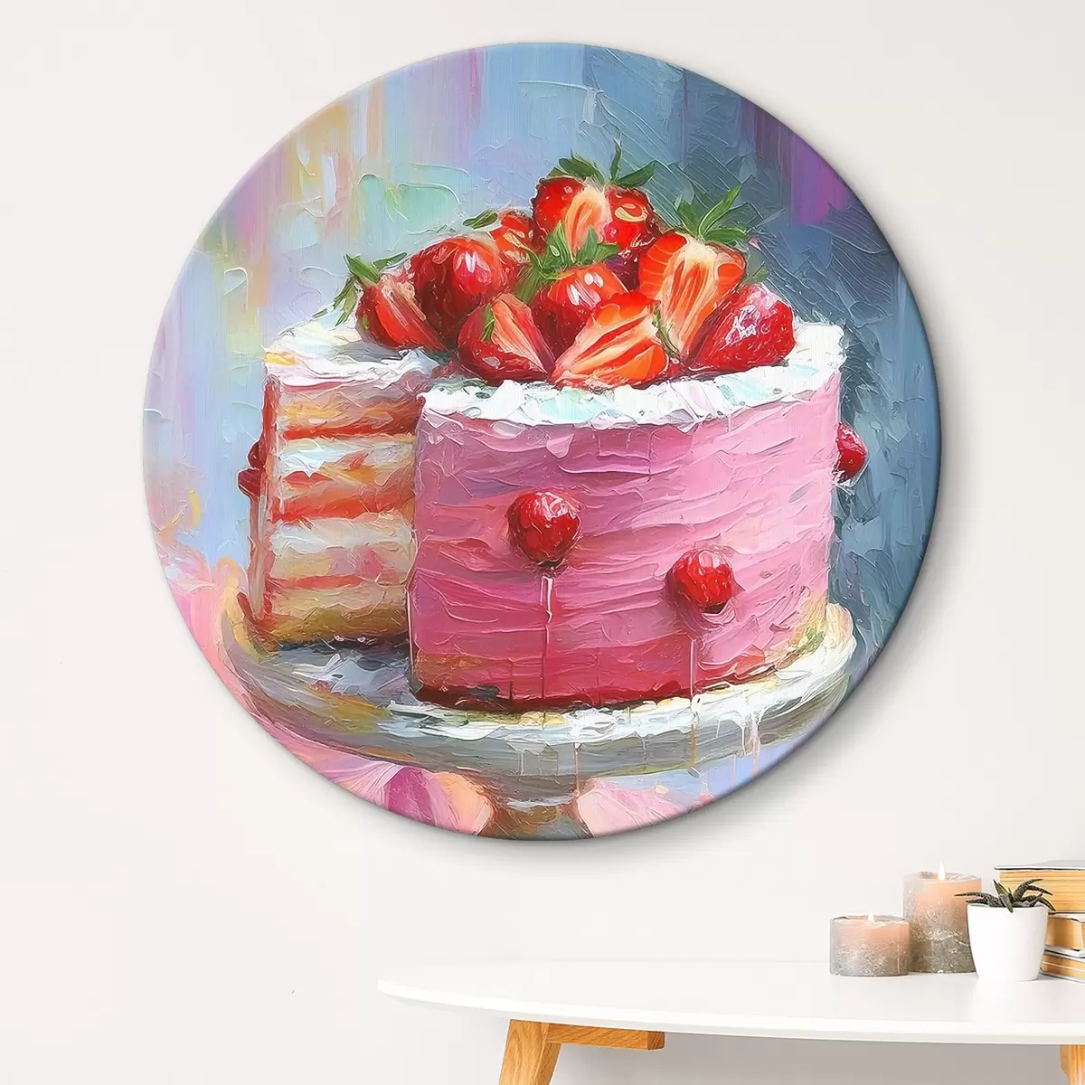 Ronde schilderijen Aardbeientaart met room, olieverf, grote penseelstreken, zomerbessen, roze kleuren r38499
