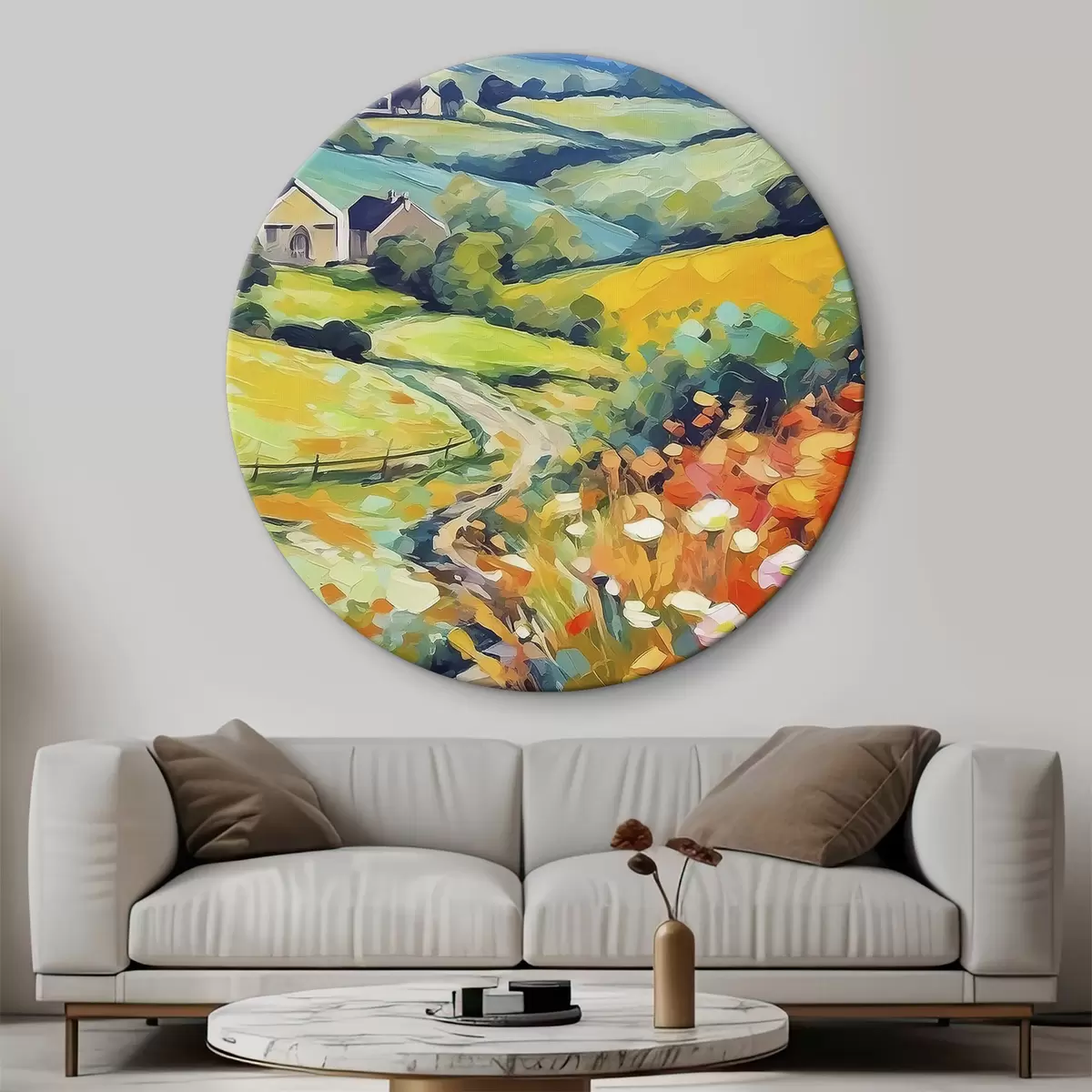 Ronde schilderijen Een schilderij van een landschap met huizen en velden Nr r38501