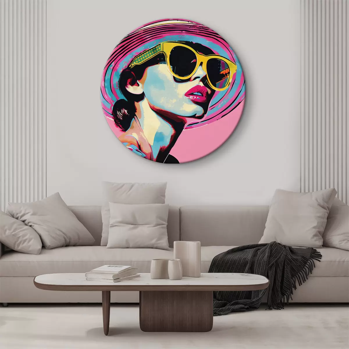 Ronde schilderijen Kleurrijk portret van een stijlvolle vrouw met zonnebril Nr r38508