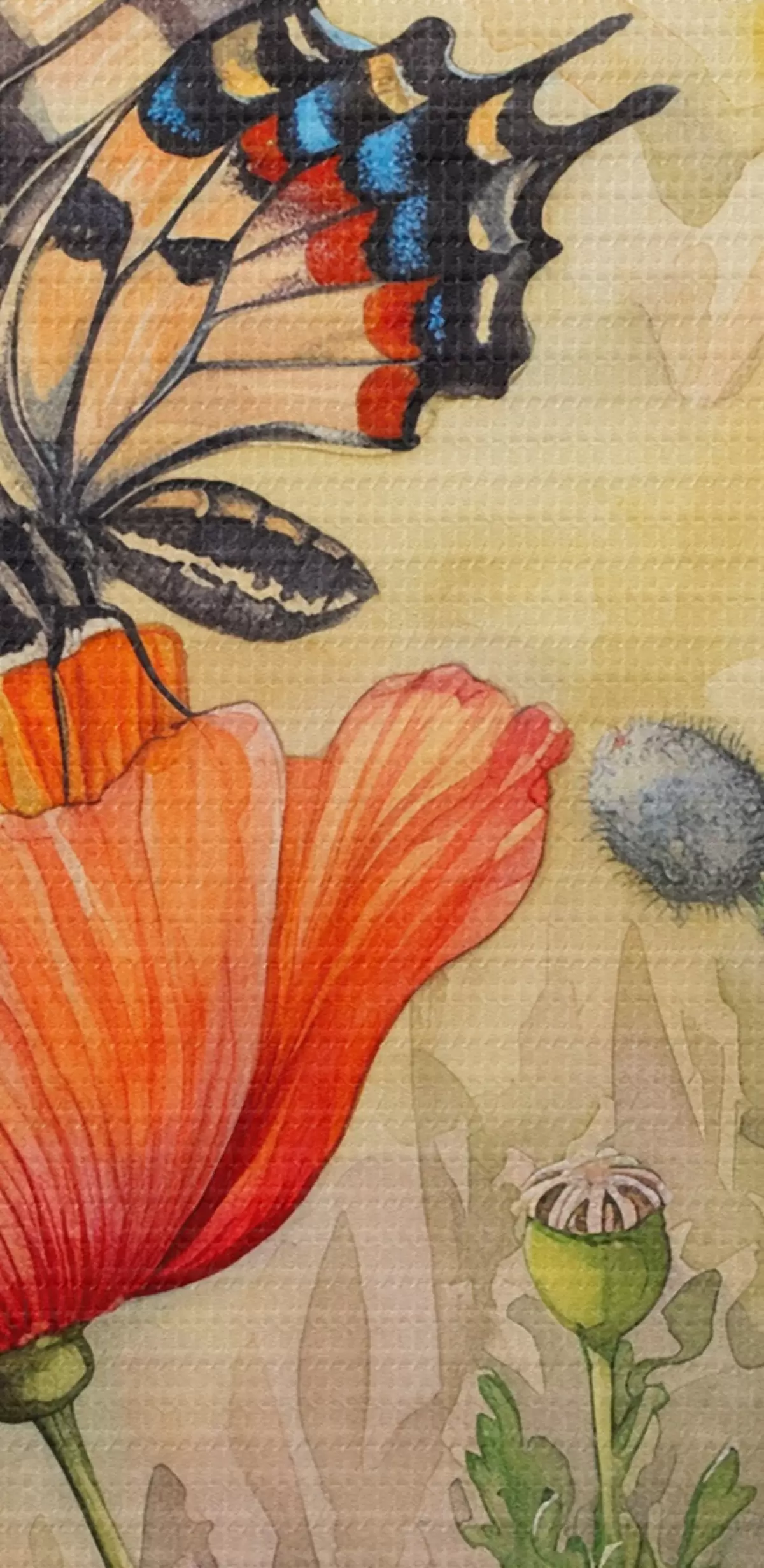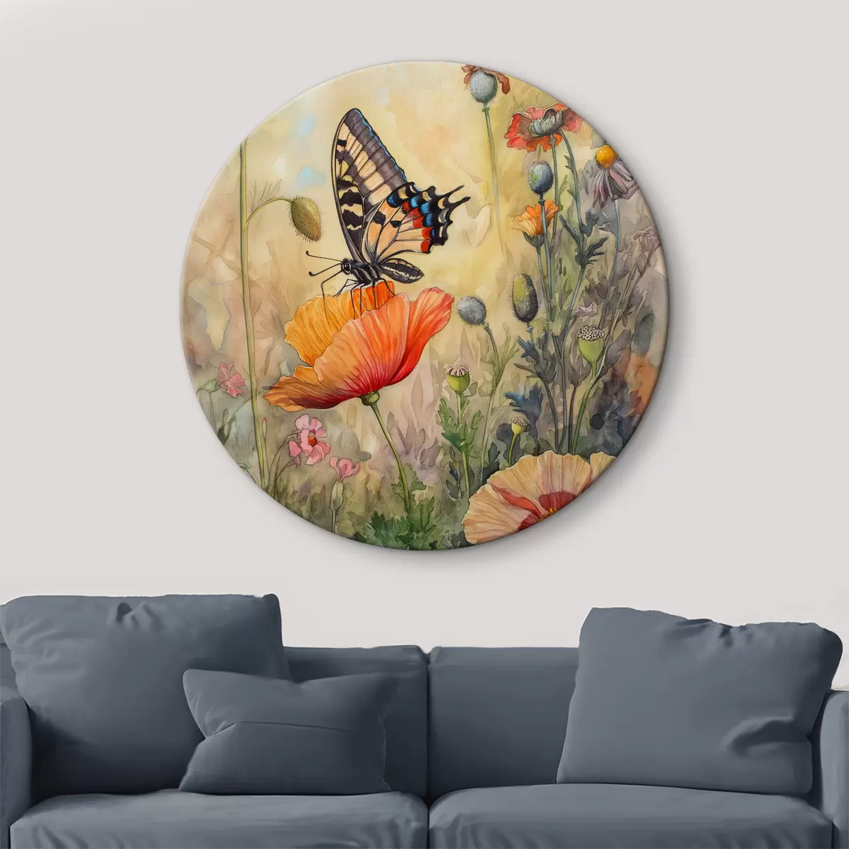Ronde schilderijen Veld van klaprozen en vlinder Nr r38520