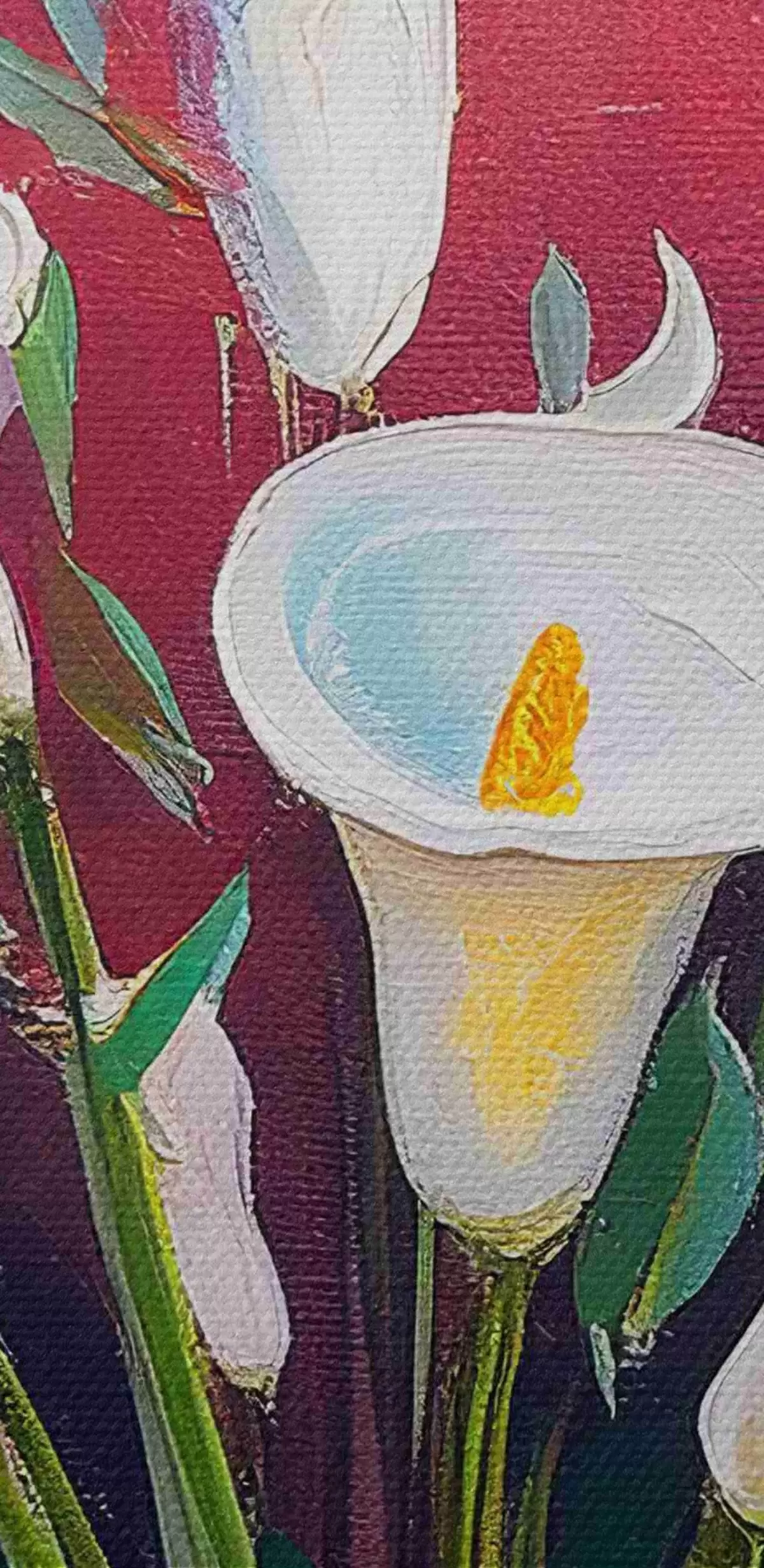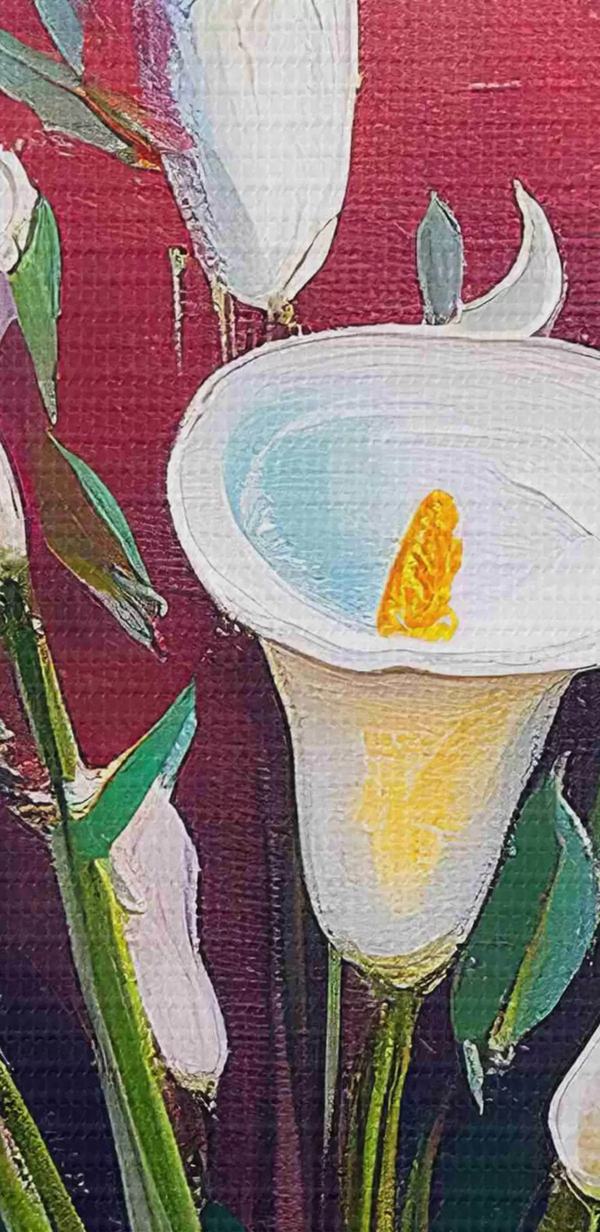 Het schilderij kan direct na ontvangst worden opgehangen. Het schilderij wordt opgespannen op een 2 cm breed houten spieraam.