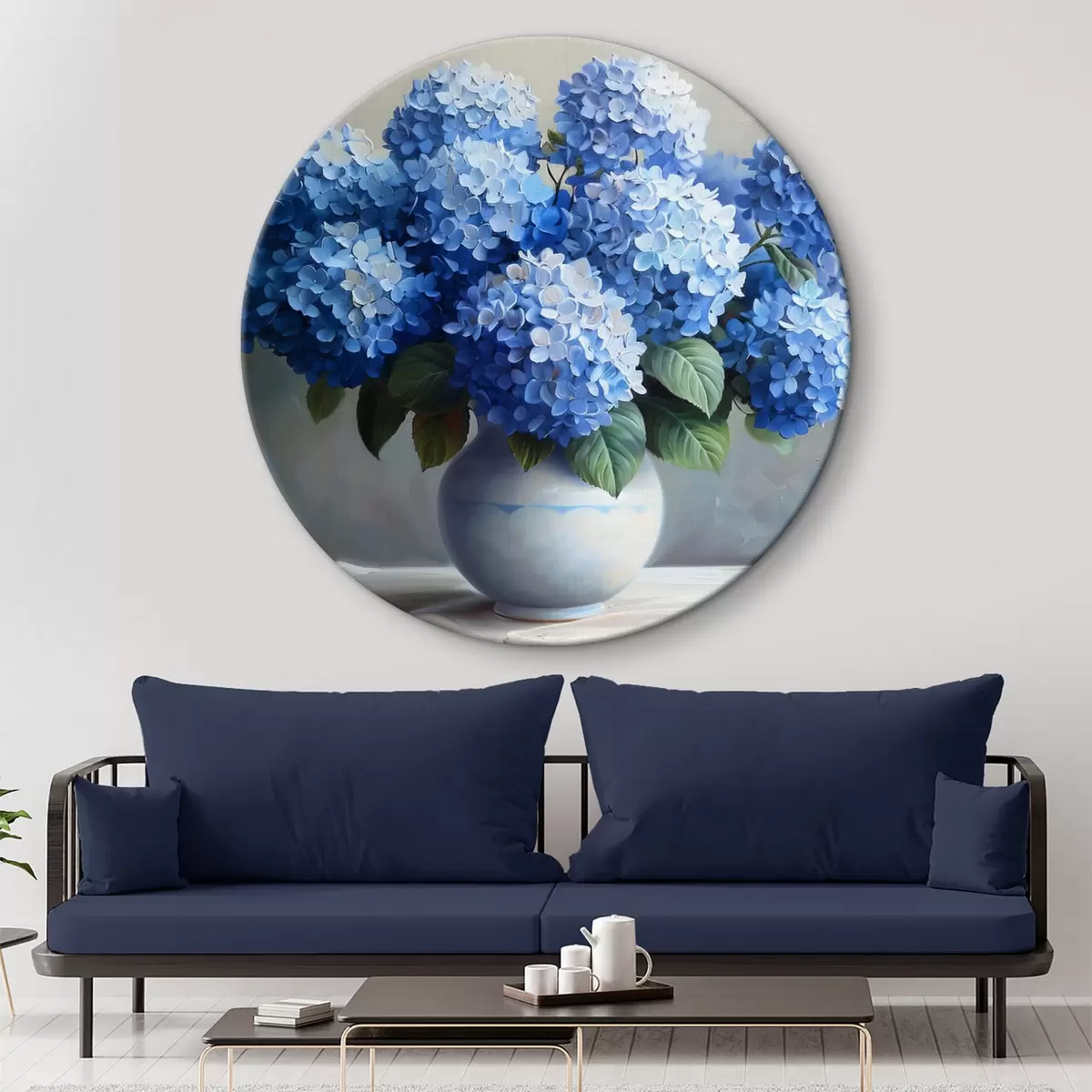 Ronde schilderijen Boeket van blauwe hortensia's in een witte vaas r38696