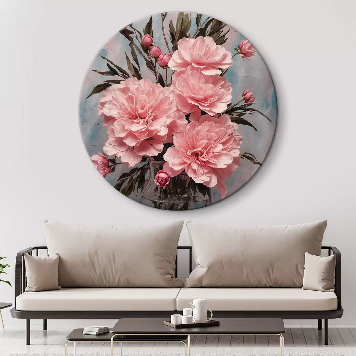 Ronde schilderijen Boeket roze bloemen in een glazen vaas Nr r38738