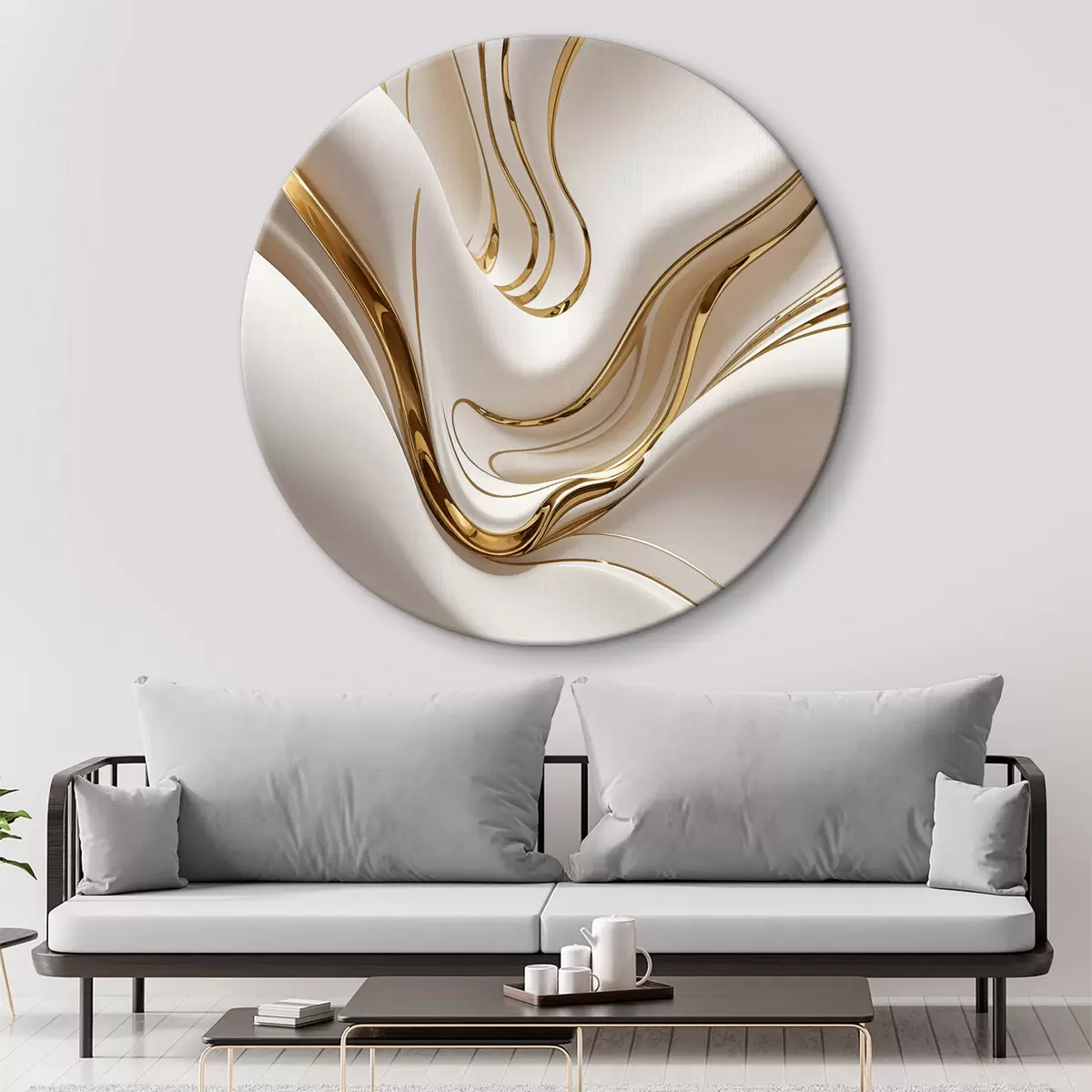 Ronde schilderijen Vloeiende witte abstracte vormen, lijkend op vloeibaar of gesmolten metaal, dynamische compositie r38767