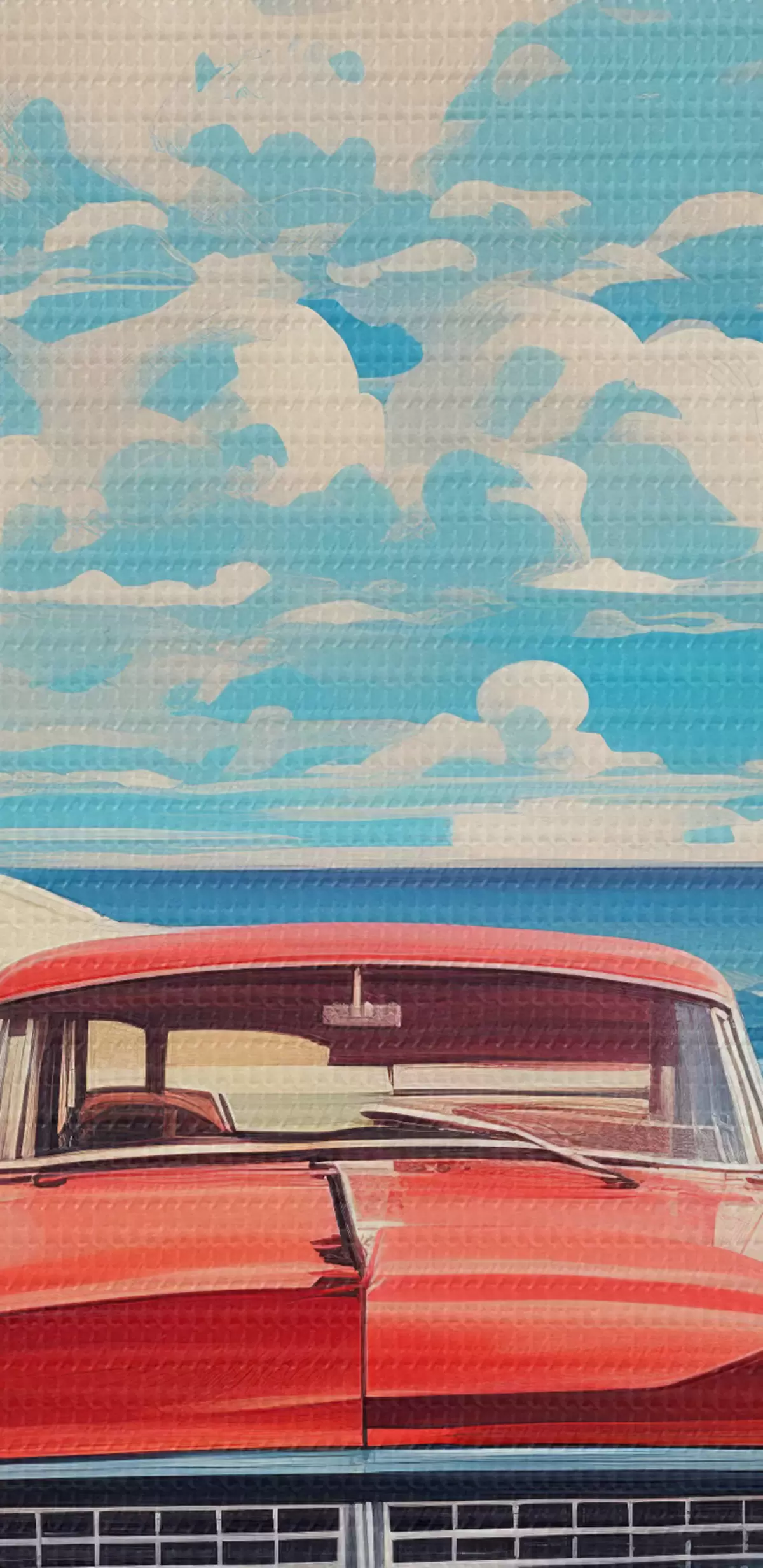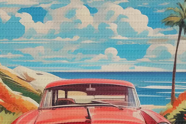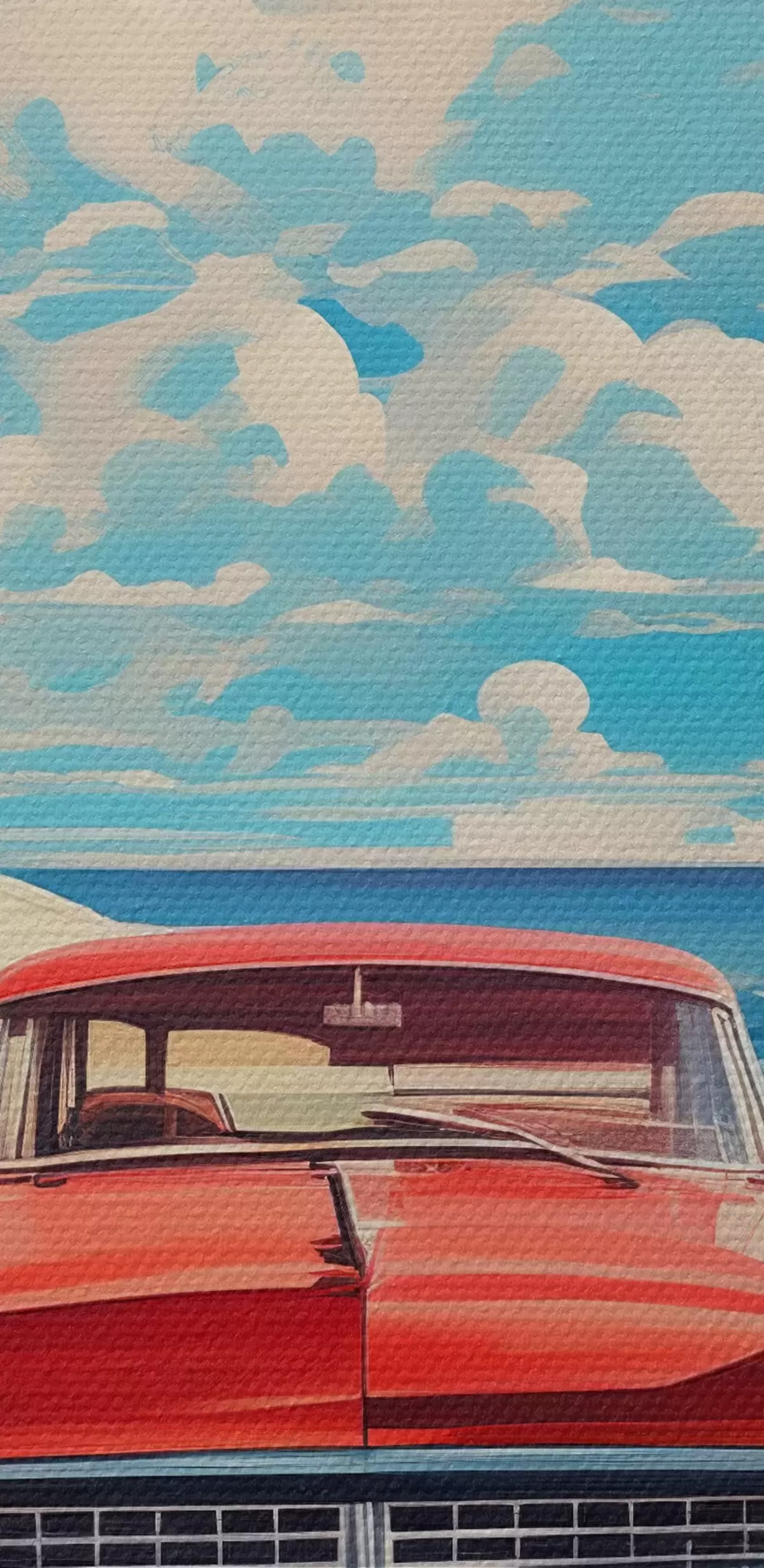 Ronde schilderijen Rode retro auto op het strand Nr r38806