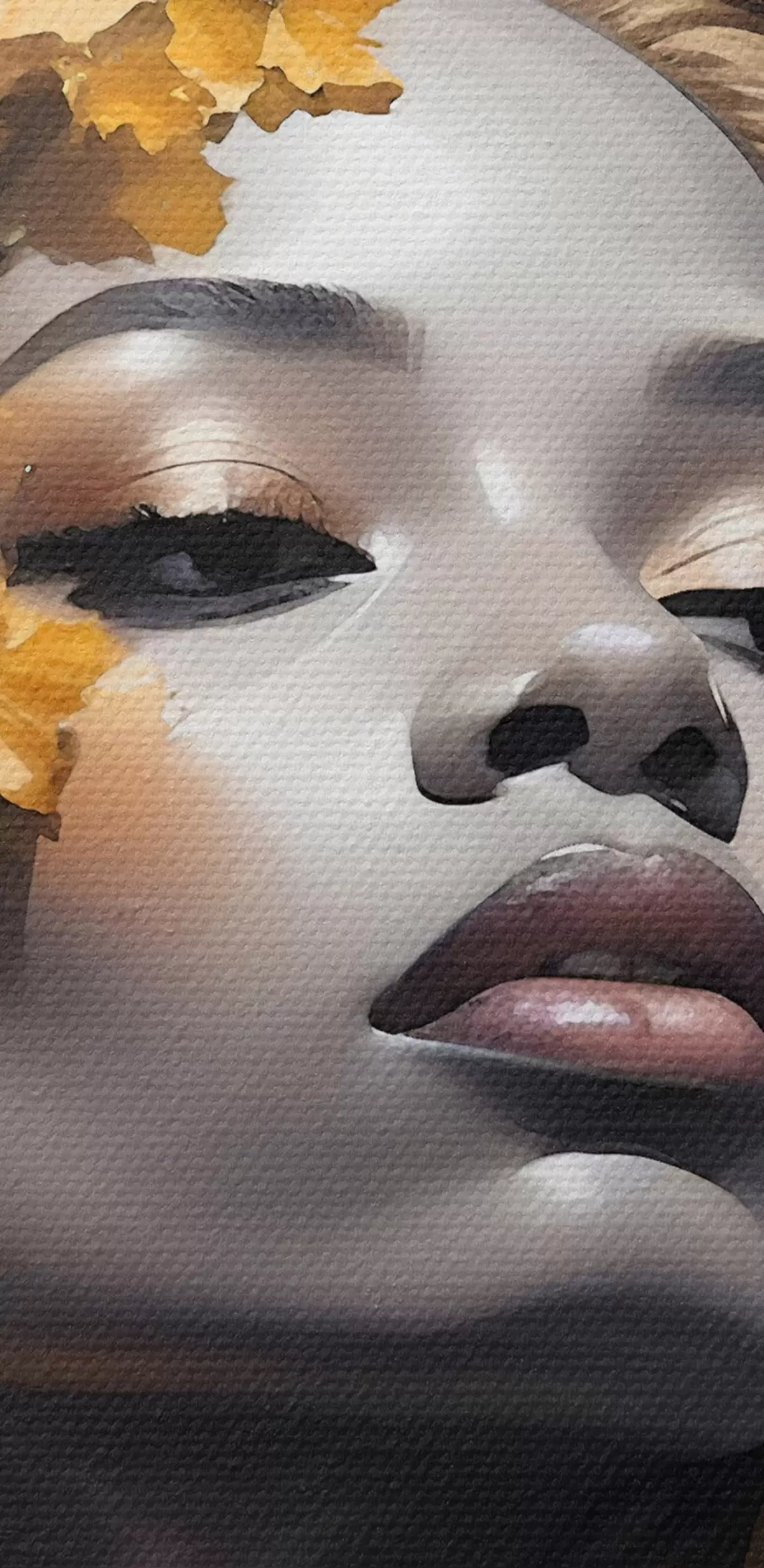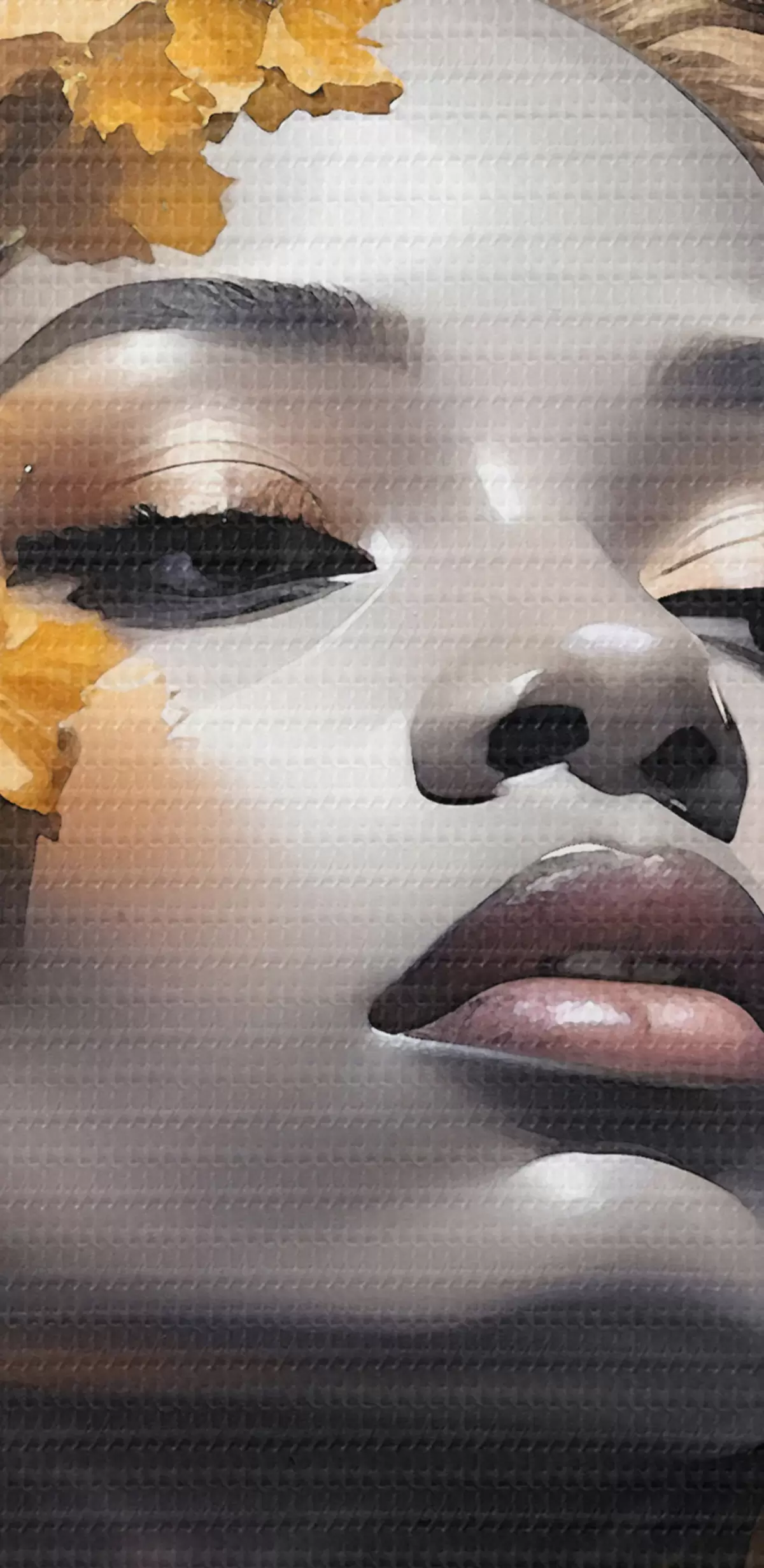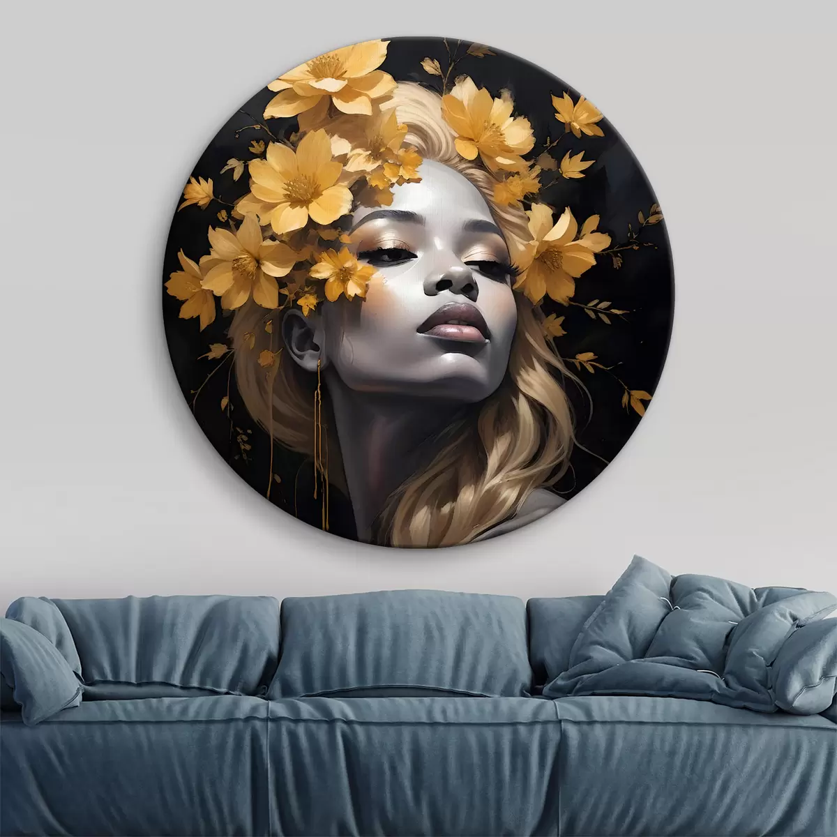 Ronde schilderijen Een portret van jonge vrouw omringd door gele herfstbladeren tegen een donkere achtergrond Nr r38834