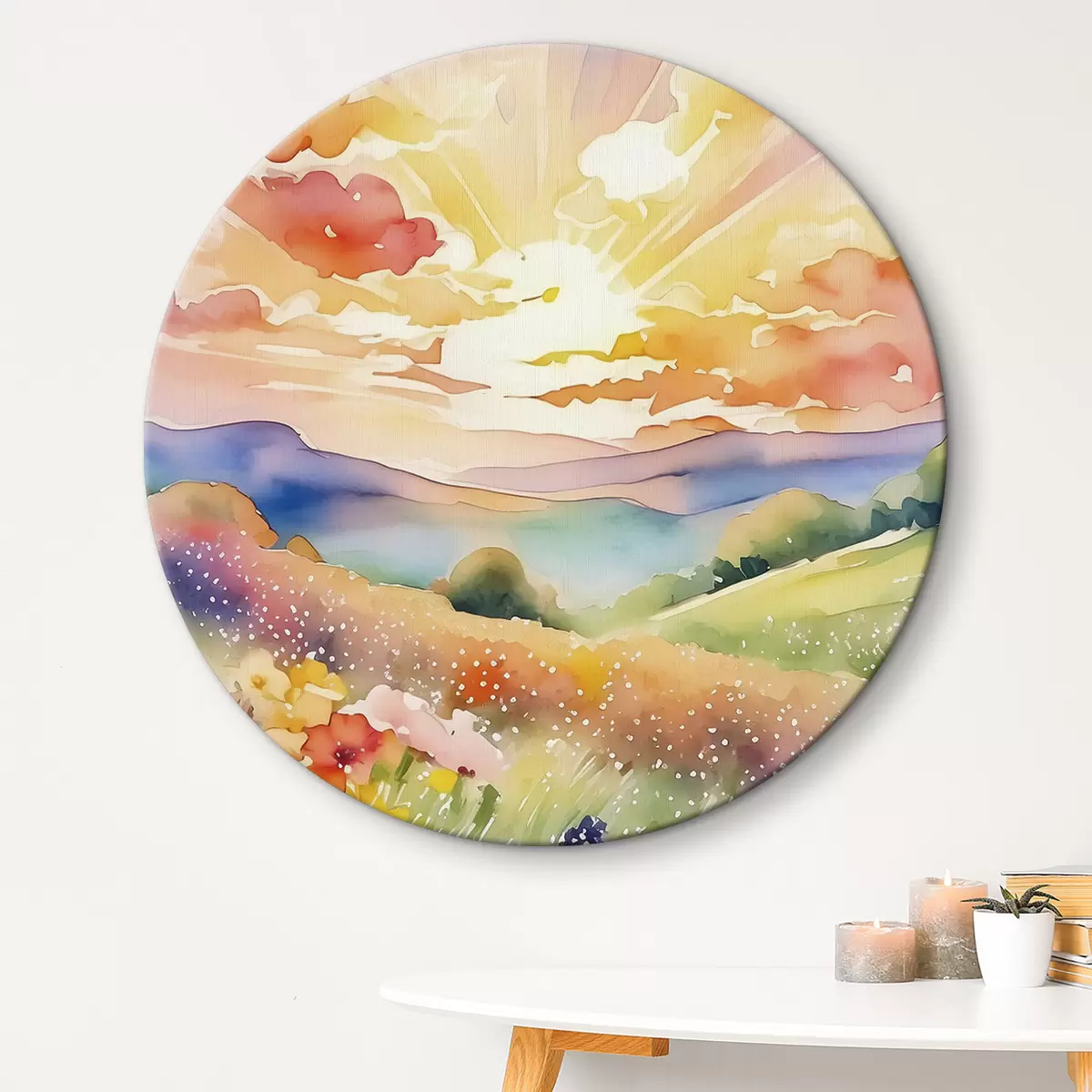 Ronde schilderijen Zonsondergang in het zomerveld, bloemen, zon, kleurrijke lucht, wolken, natuur Nr r38842