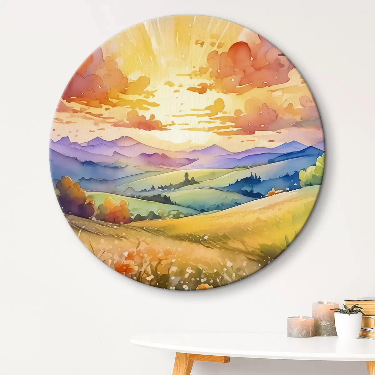 Ronde schilderijen Zomerweide, kleurrijke lucht met wolken, bomen en bloemen, berglandschap Nr r38844