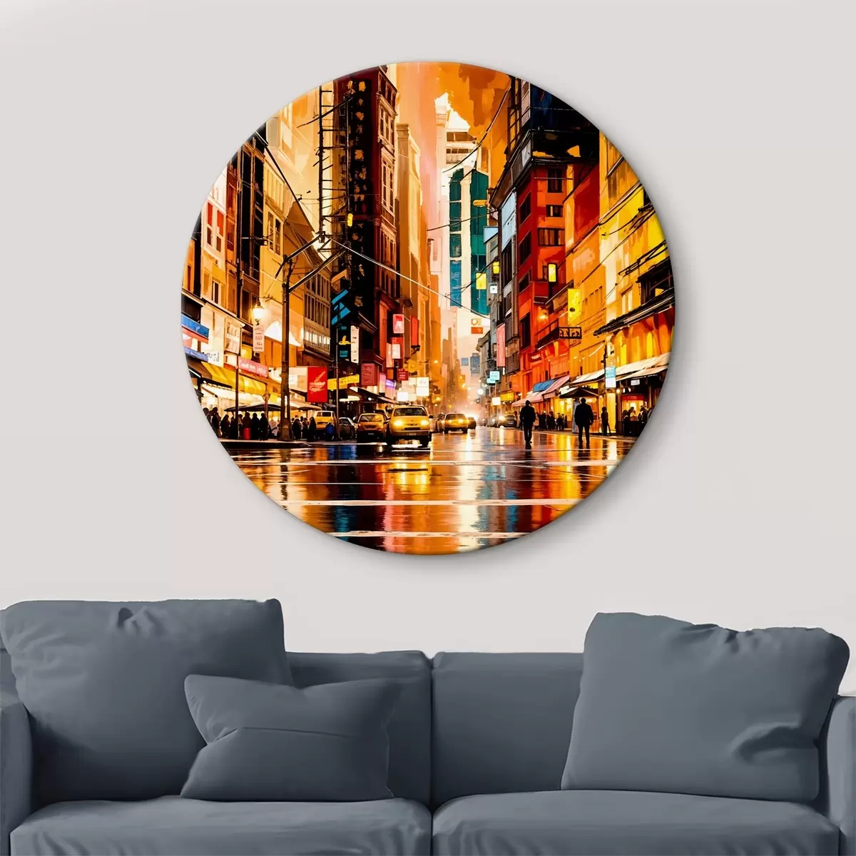 Ronde schilderijen Landschapsschilderij van stadsstraat 's nachts met hoge gebouwen, neonreclames en gele taxi's. Nr r38897