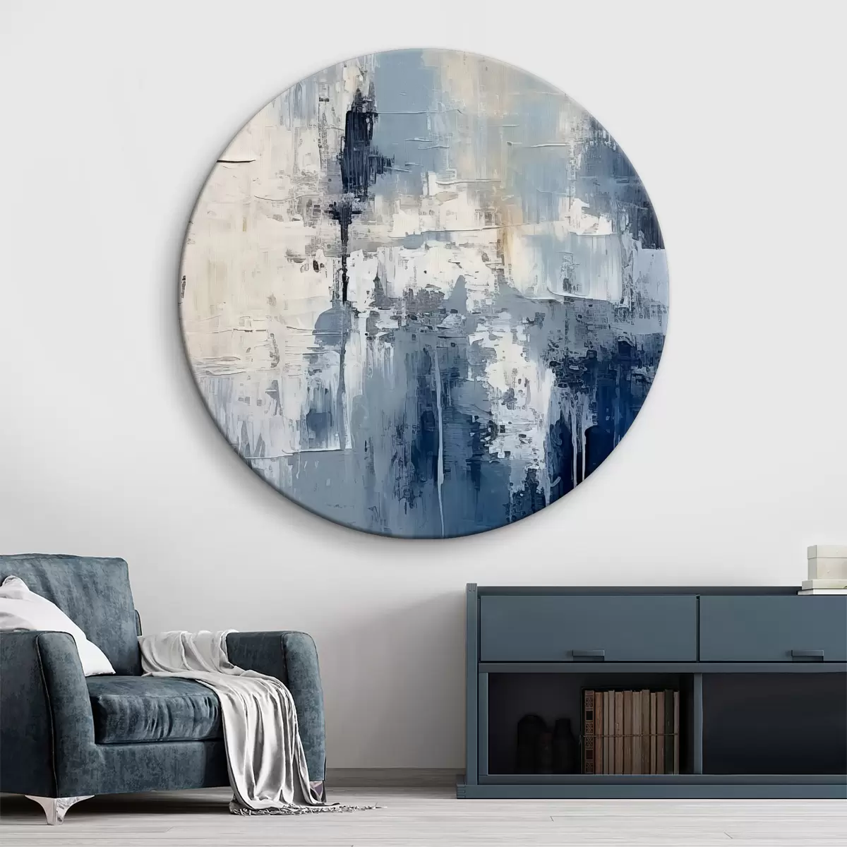 Ronde schilderijen Abstract minimalistisch olieverfschilderij, gewreven, geometrisch, vlek, blauwe en witte kleur Nr r38906