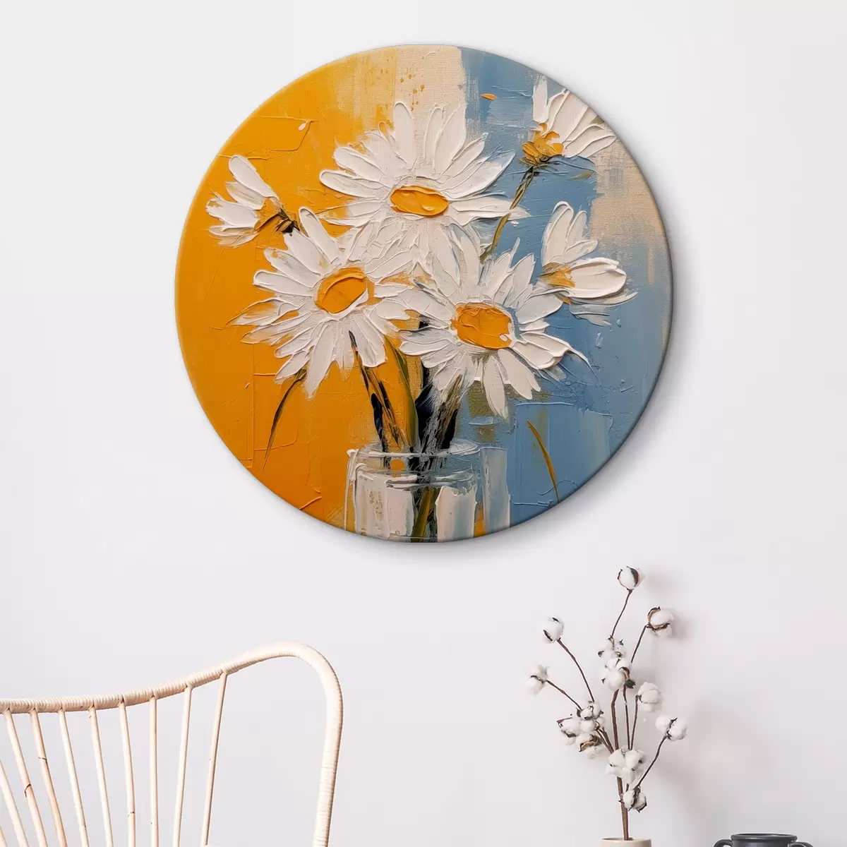 Ronde schilderijen Witte madeliefjes in een glazen vaas op een blauwe en gele achtergrond, imitatie van olieverfschilderij, grote lijnen Nr r38907