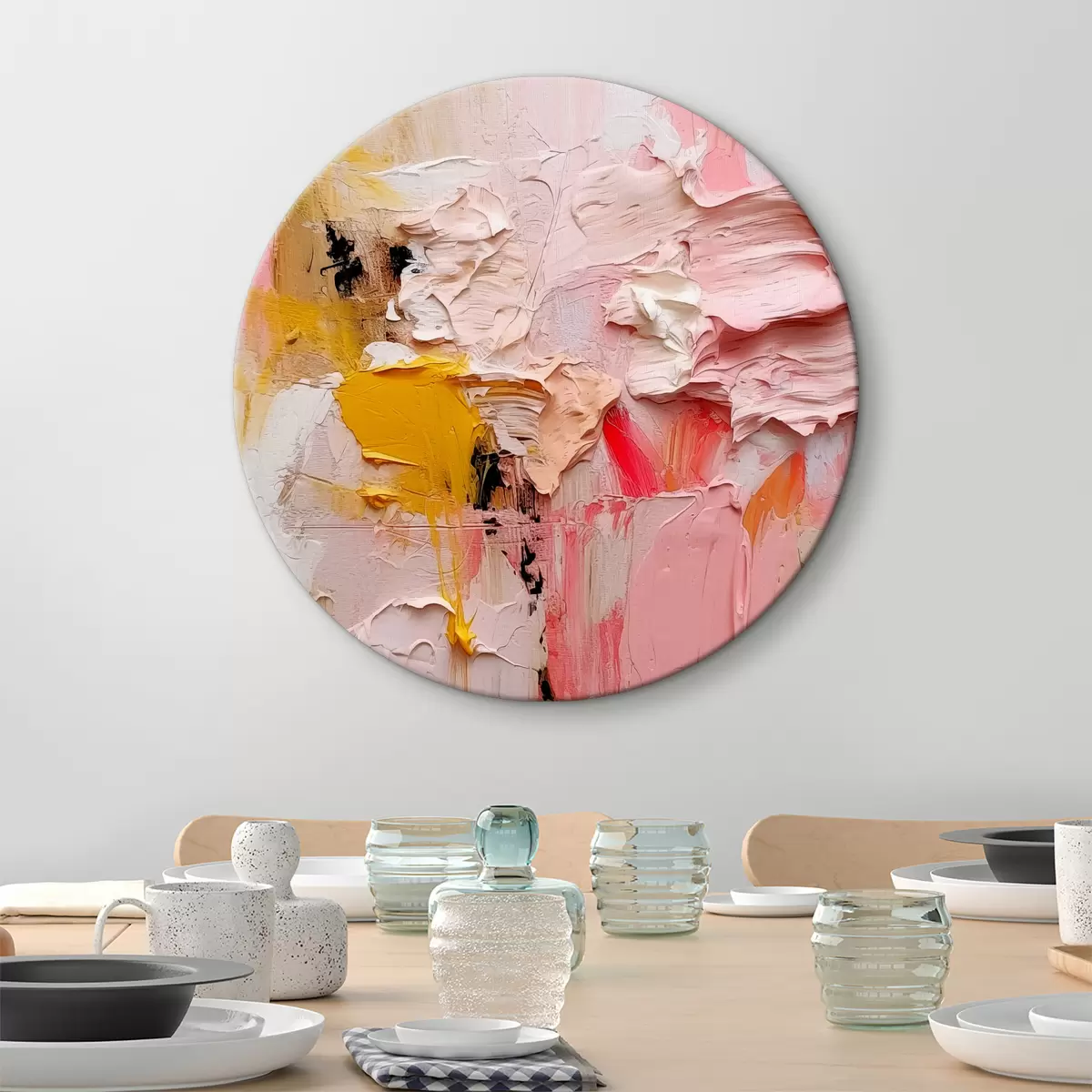 Ronde schilderijen Abstract expressionisme van grote verfstreken in roze, geel en wit Nr r38916