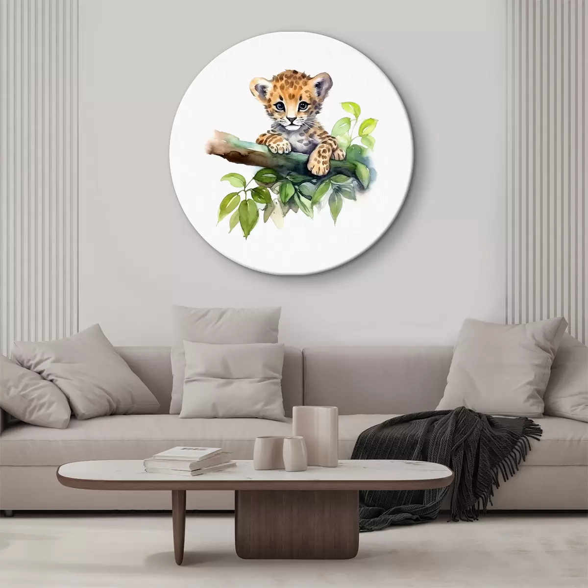 Ronde schilderijen Luipaardwelp zittend op een tak met groene bladeren, dier, aquarel Nr r38922