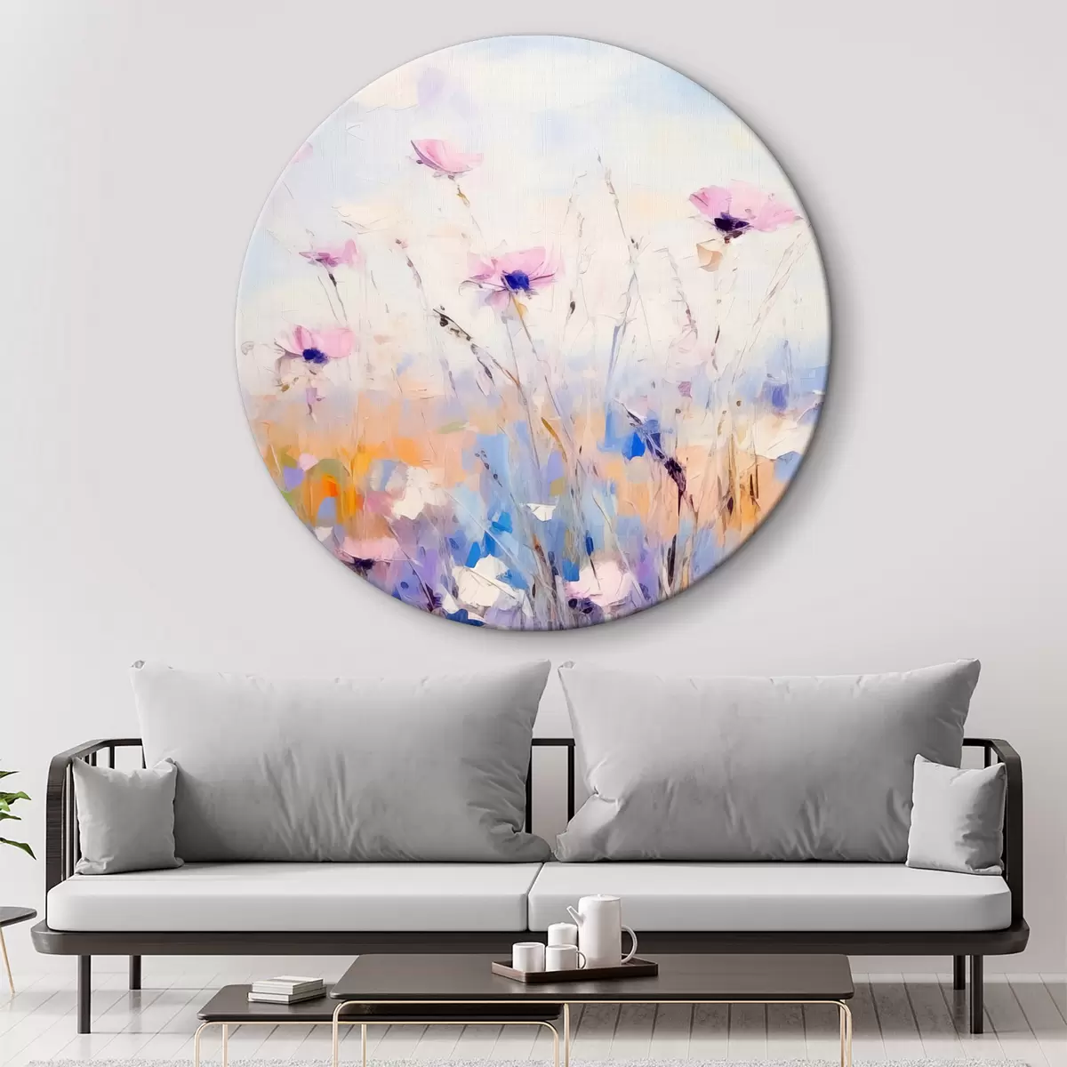 Ronde schilderijen Bloeiende korenbloemen wilde bloemen in een veldolieverfschilderij, blauwe, roze, paarse, oranje kleur Nr r38937