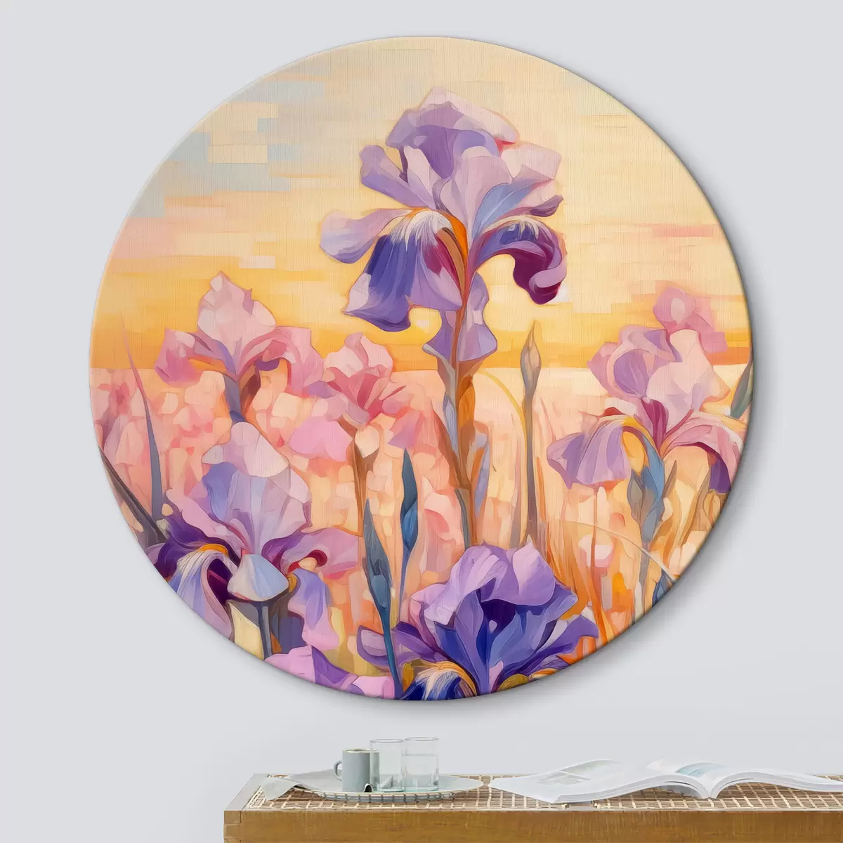 Ronde schilderijen Bloeiende irissen in een veld bij zonsondergang olieverfschilderij, blauwe, oranje, paarse, roze, gele kleur Nr r38941