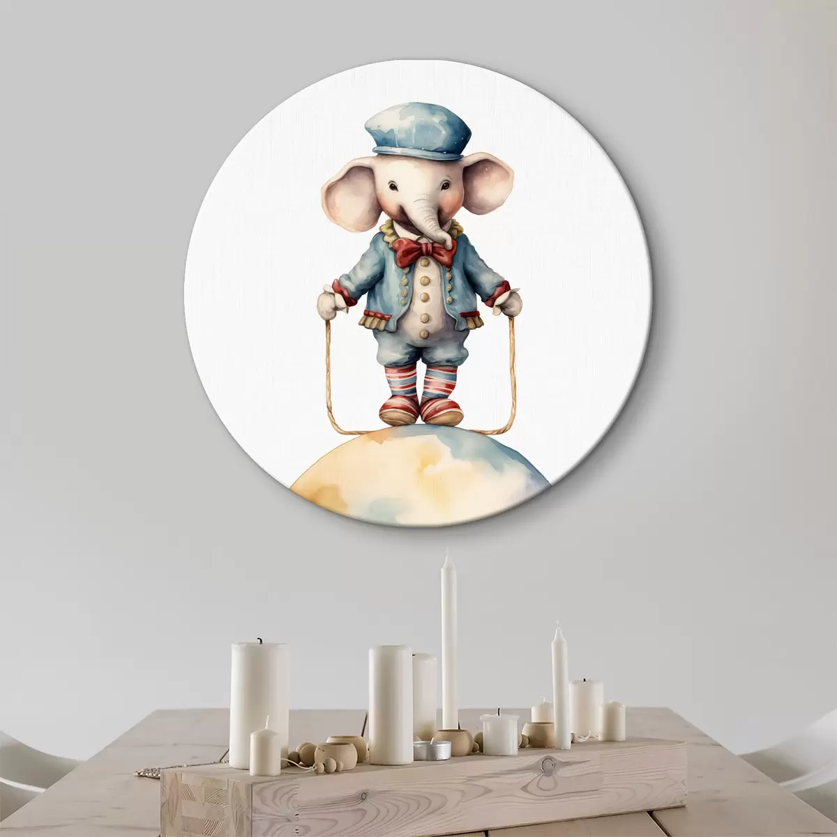 Ronde schilderijen Olifant balanceert op een gekleurde wereldbol Nr r38950