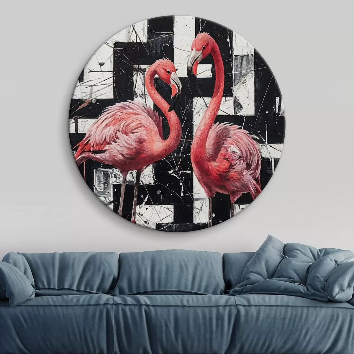 Ronde schilderijen Twee roze flamingo's staan voor een zwart-wit abstract schilderij als achtergrond Nr r38954