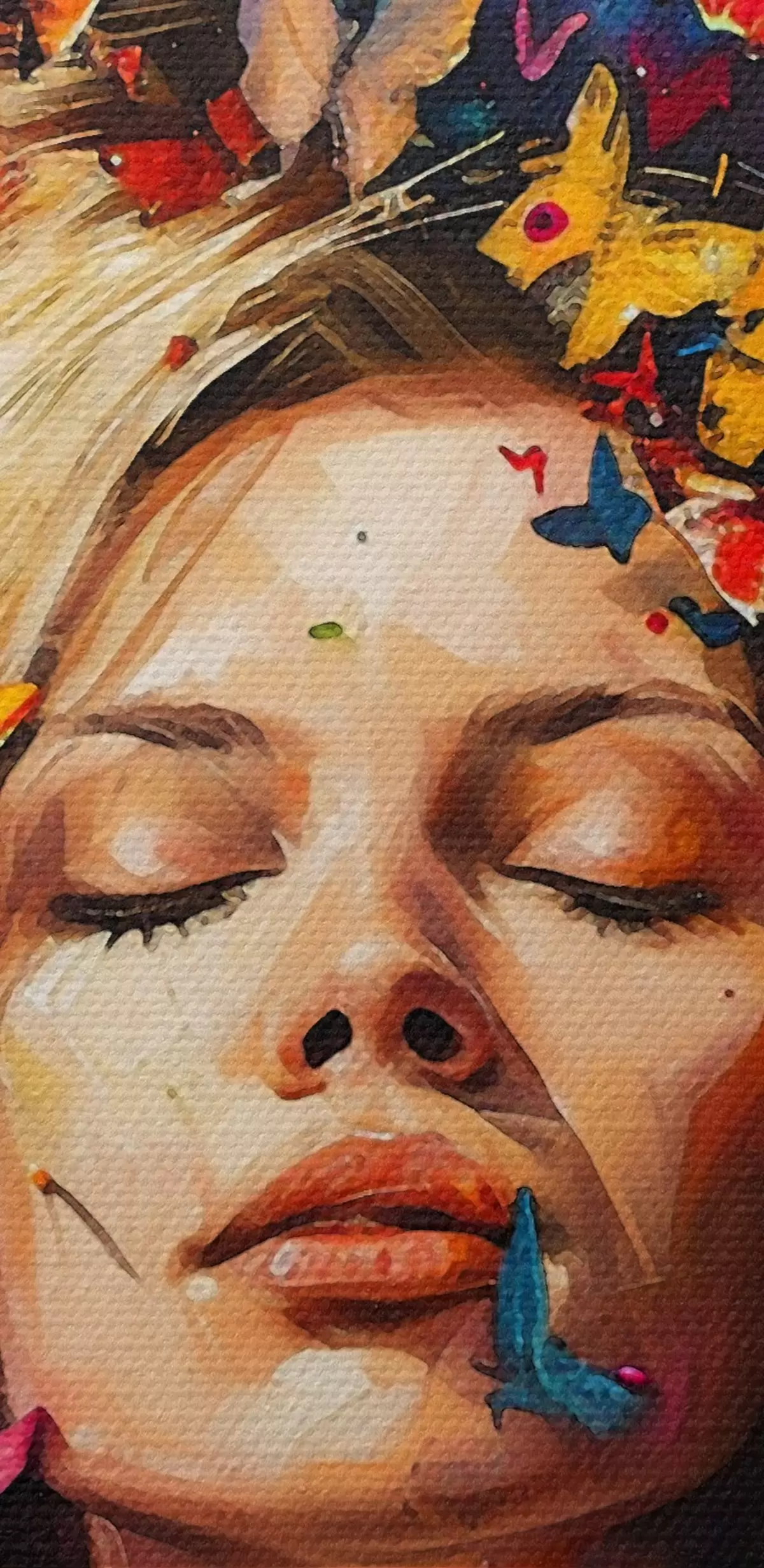 Ronde schilderijen Olieverfschilderij van een jonge vrouw omringd door een zwerm kleurrijke vlinders tegen een donkere achtergrond r38972