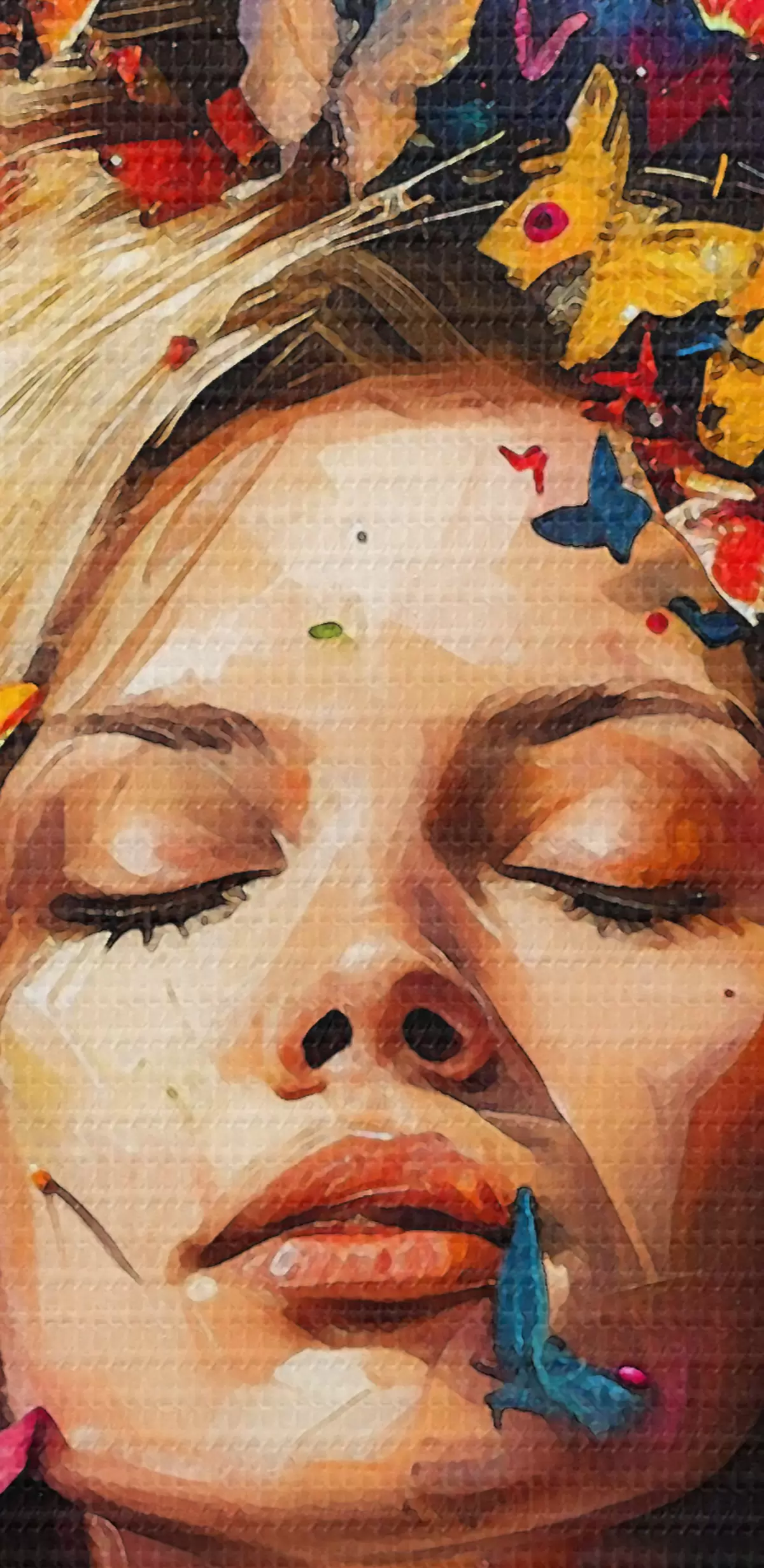 Ronde schilderijen Olieverfschilderij van een jonge vrouw omringd door een zwerm kleurrijke vlinders tegen een donkere achtergrond Nr r38972