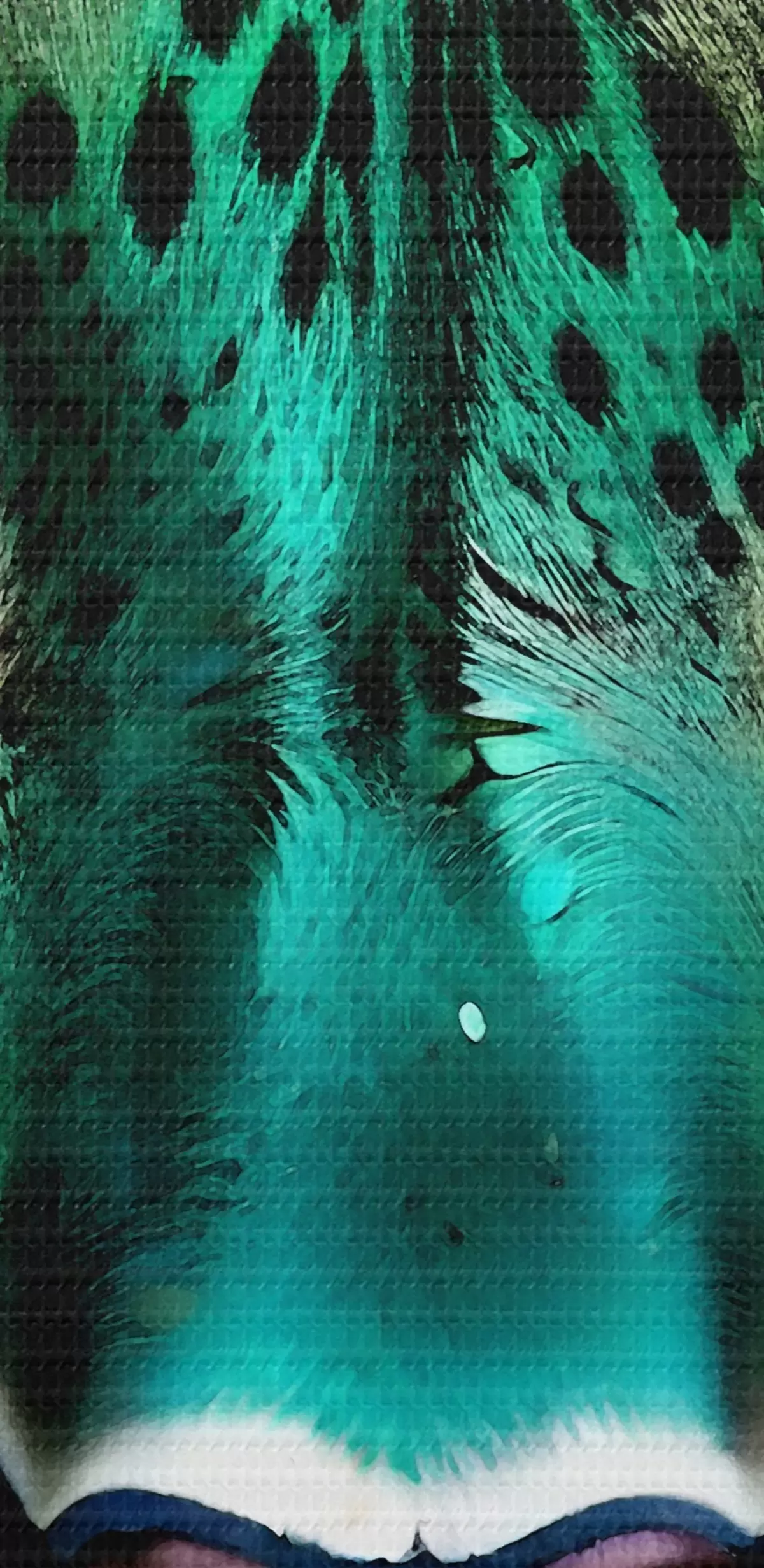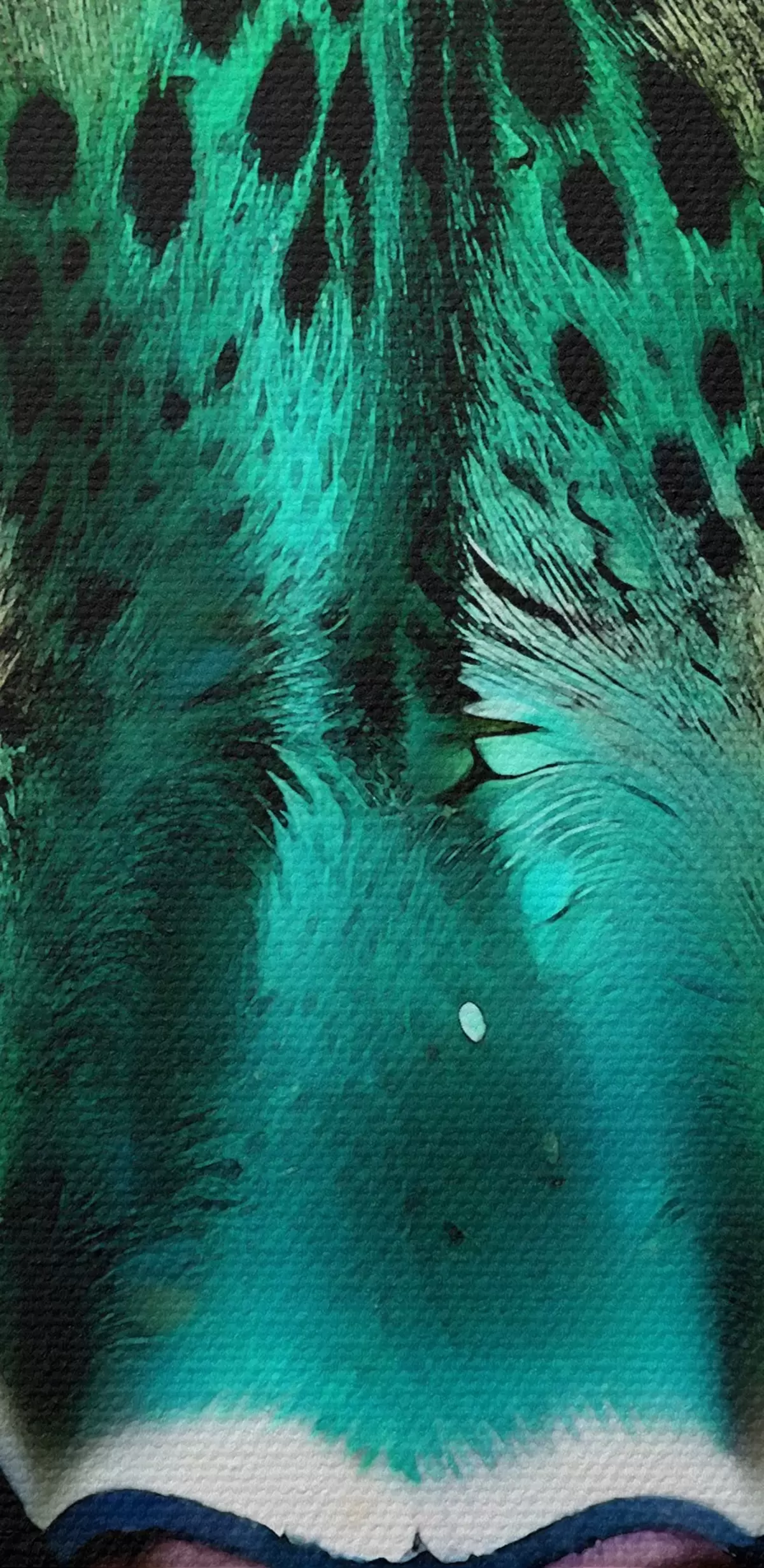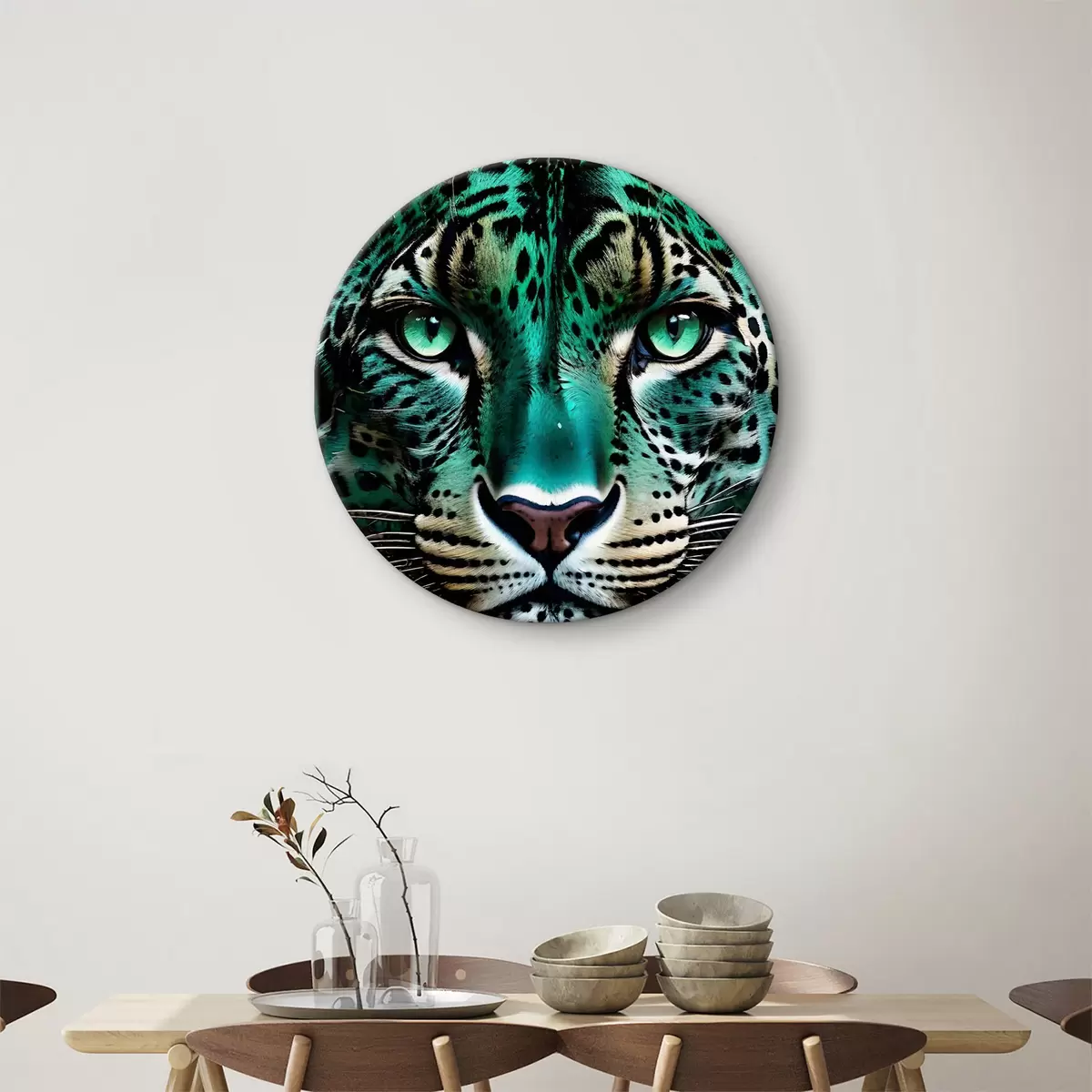 Ronde schilderijen Een close-upportret van een fel groenogig luipaard met levendige turkoois en zwart gevlekte vacht Nr r38979