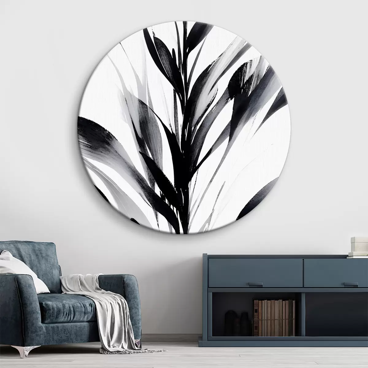Ronde schilderijen Abstracte inkttekening van zwart-witte bladeren, met scherpe, hoekige vormen en hoog contrast Nr r38981