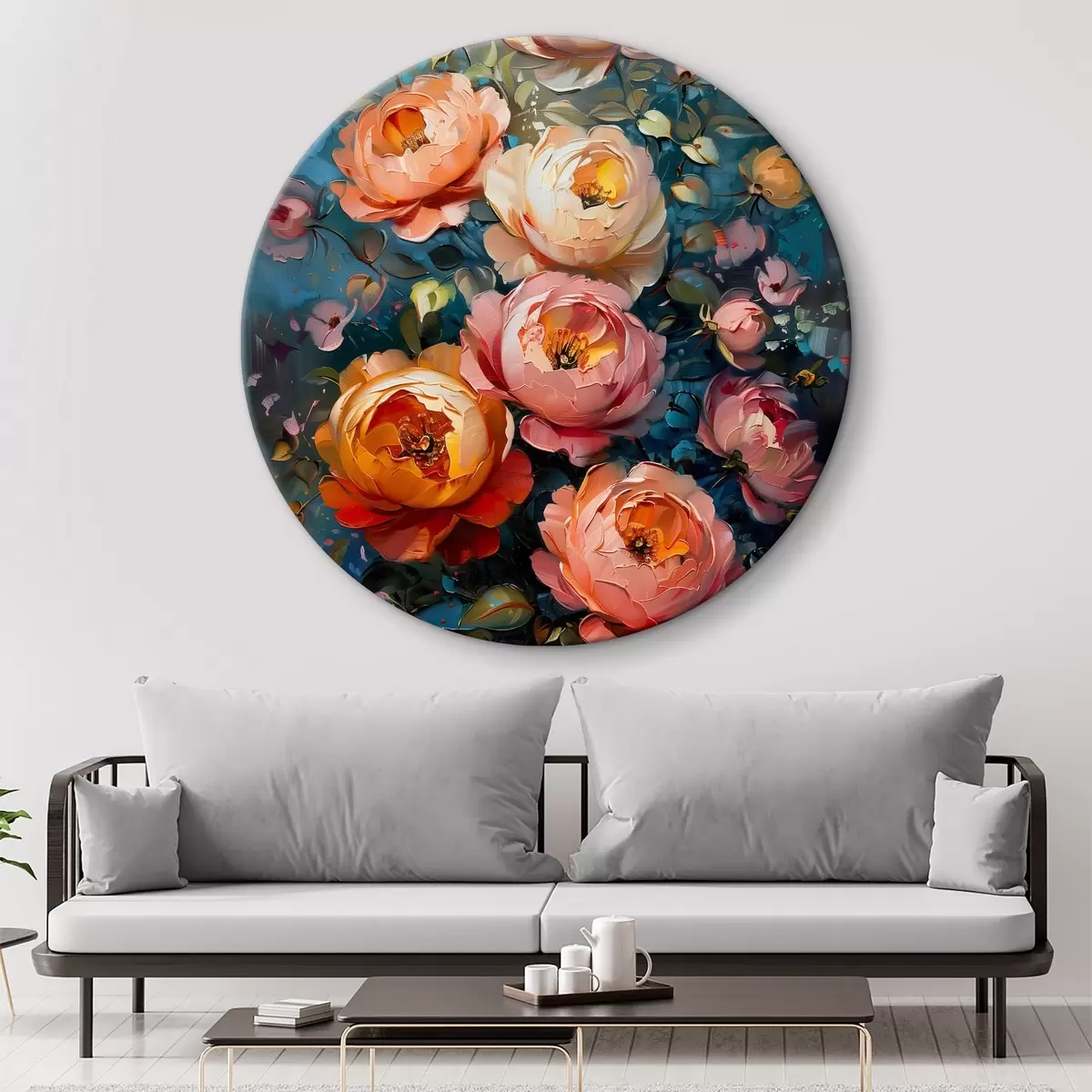 Ronde schilderijen Roze bloemen op een blauwe achtergrond Nr r38992