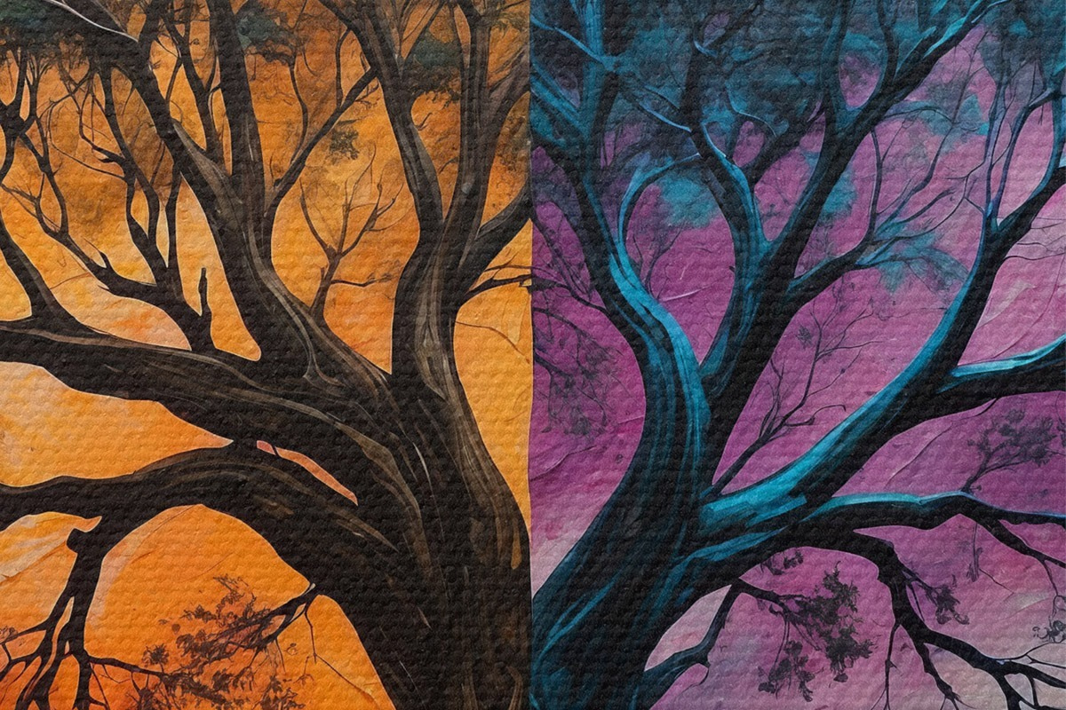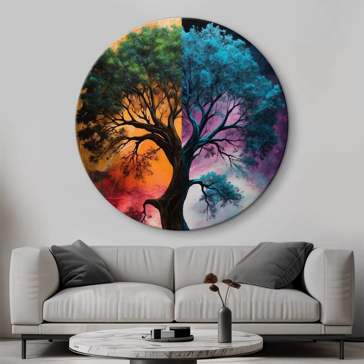 Ronde schilderijen Een boom tegen de achtergrond van een in tweeën gedeelde lucht Nr r38997