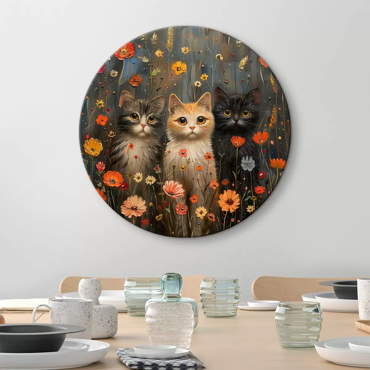 Ronde schilderijen Drie katten in wilde bloemen r39012