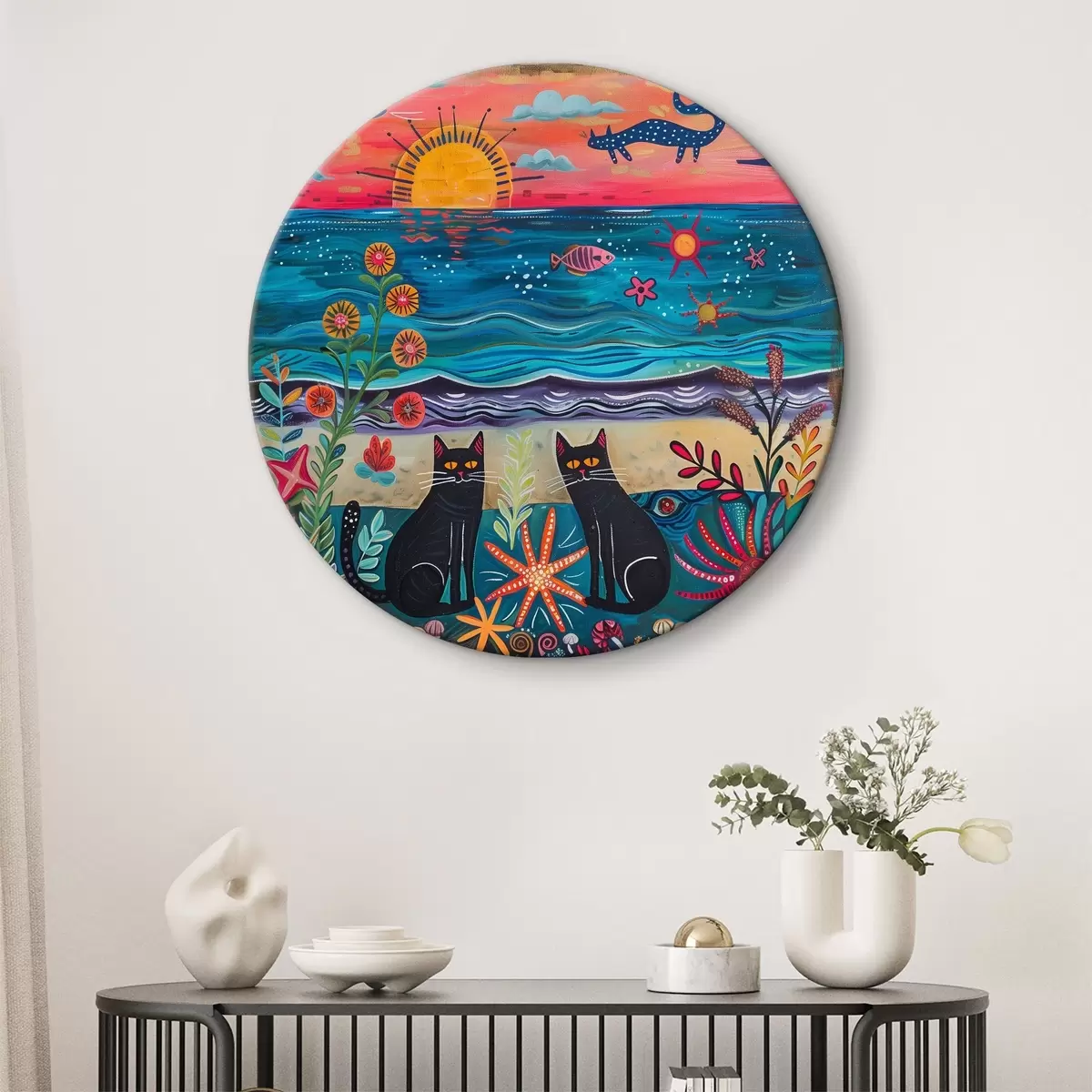 Ronde schilderijen Twee katten kijken naar de zonsopgang Nr r39086