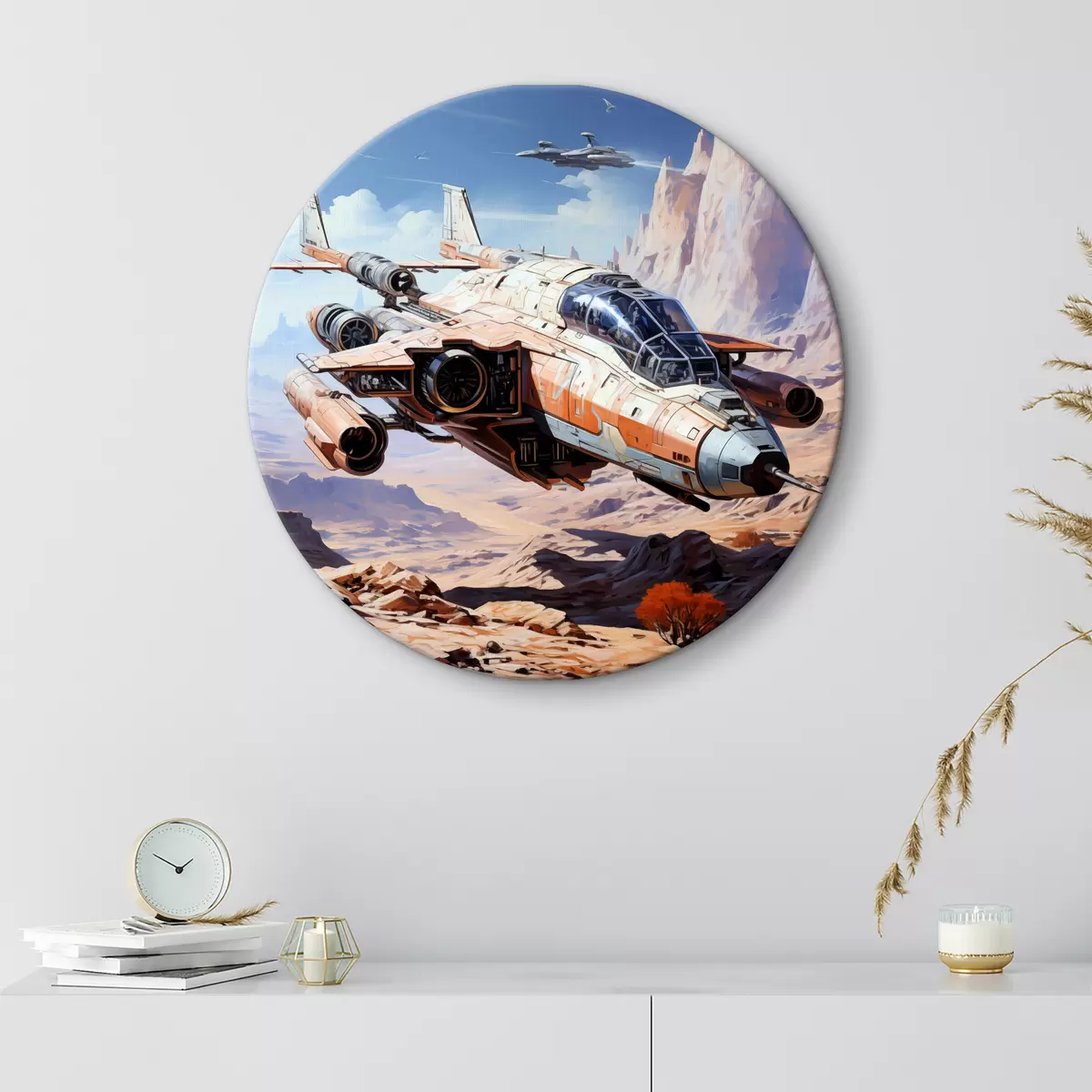 Ronde schilderijen Een ruimteschip in cyberpunkstijl vliegt tussen bergen en wolken, maanlandschap, blauwe, beige, witte kleur Nr r39113
