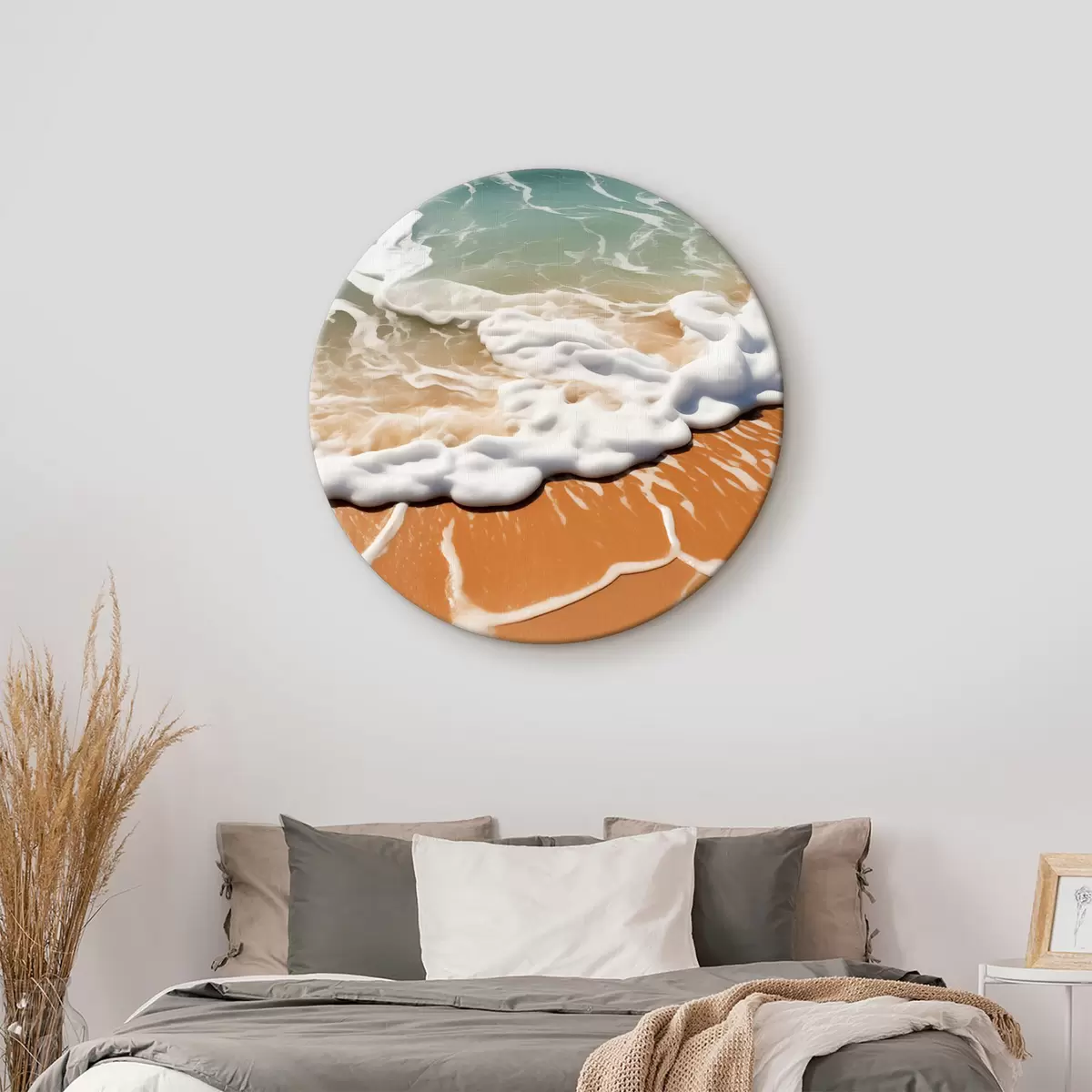 Ronde schilderijen Zeegolfschuim verbindt zich met de zandkust, blauw, wit en oranje, beige kleur Nr r39122