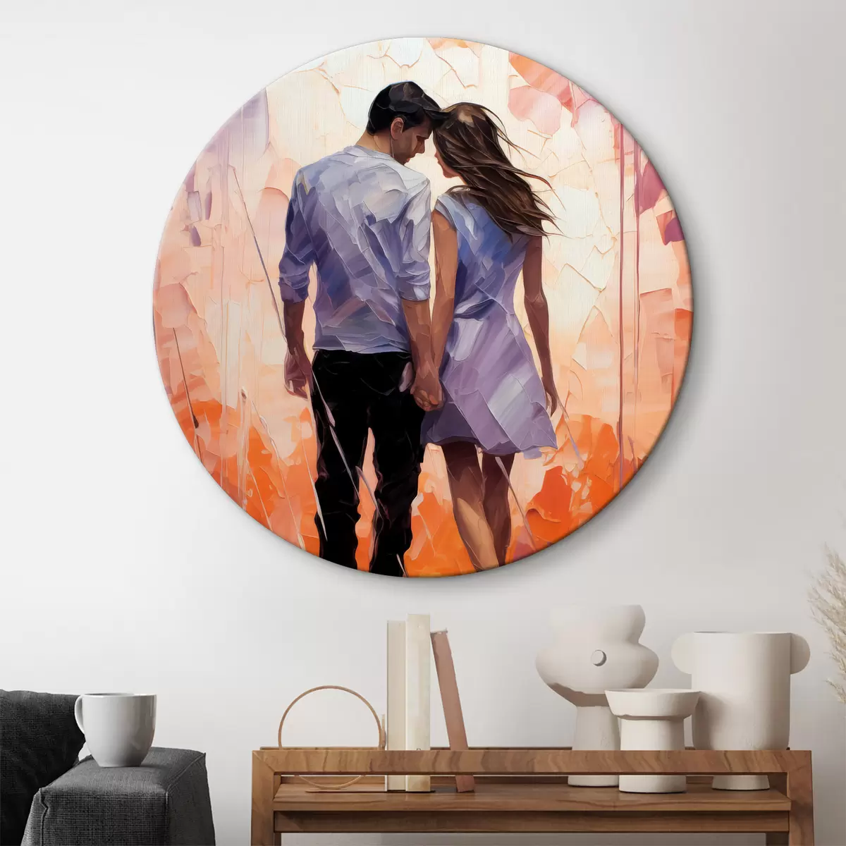 Ronde schilderijen Silhouet van een verliefd stel abstract schilderij, meisje en jongen, roze, oranje, paarse, zwarte kleur r39124