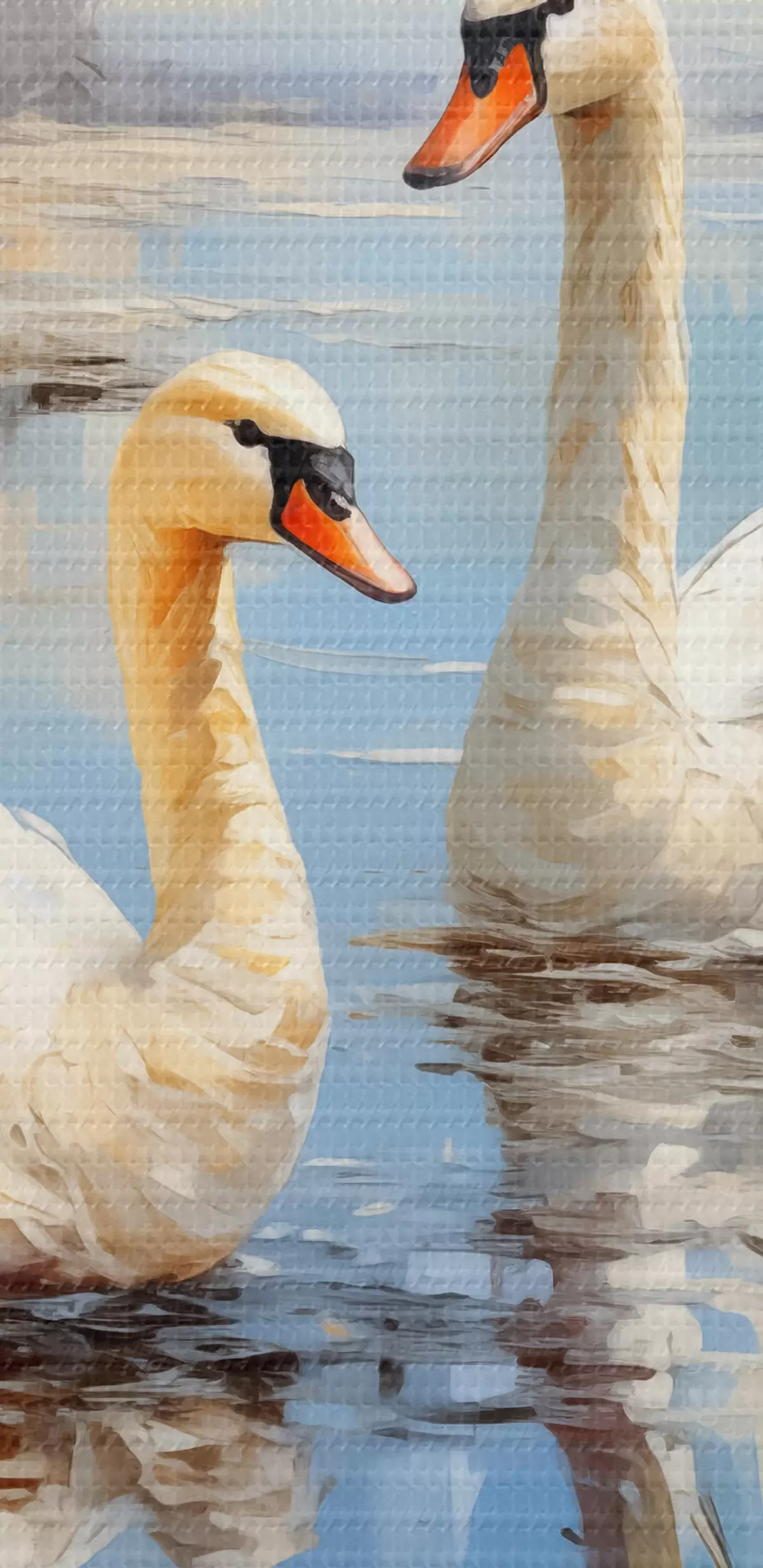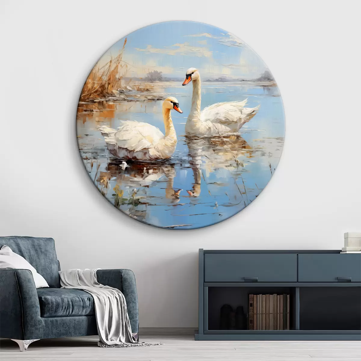 Ronde schilderijen Witte ganzen zwemmen langs de rivier tussen het riet, blauw, wit, beige van kleur Nr r39130
