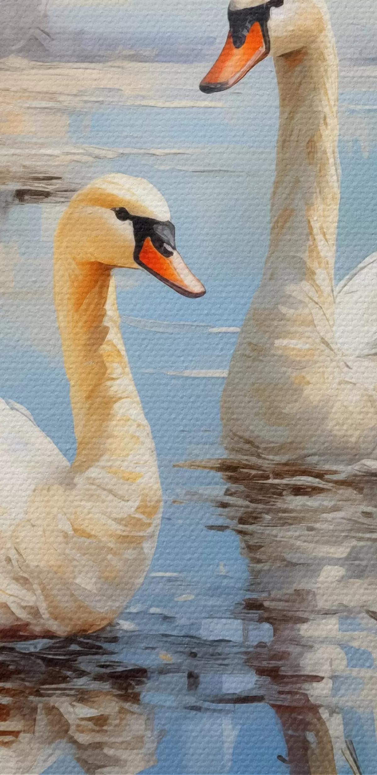 Ronde schilderijen Witte ganzen zwemmen langs de rivier tussen het riet, blauw, wit, beige van kleur r39130