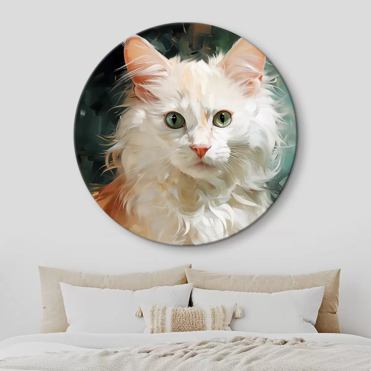 Ronde schilderijen Witte pluizige kat met groene ogen op een groen portret als achtergrond Nr r39132
