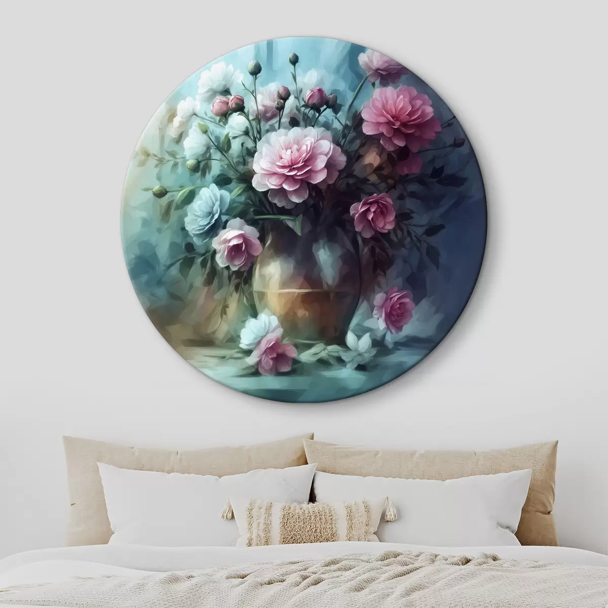 Ronde schilderijen Bloemen in vaas op bewolkte blauwe achtergrond Nr r39164