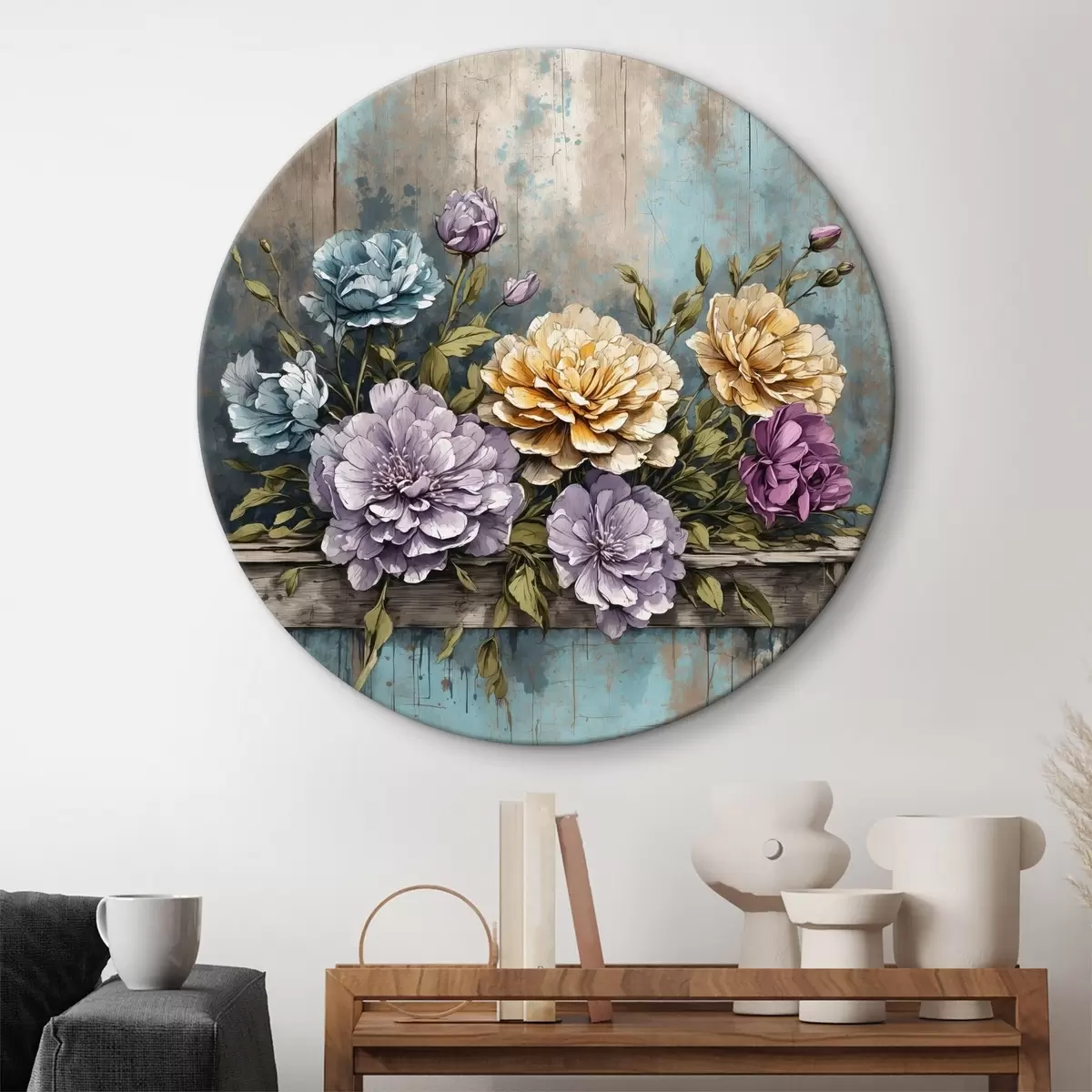 Ronde schilderijen Bloemen en bladeren op oude houten plank Nr r39169