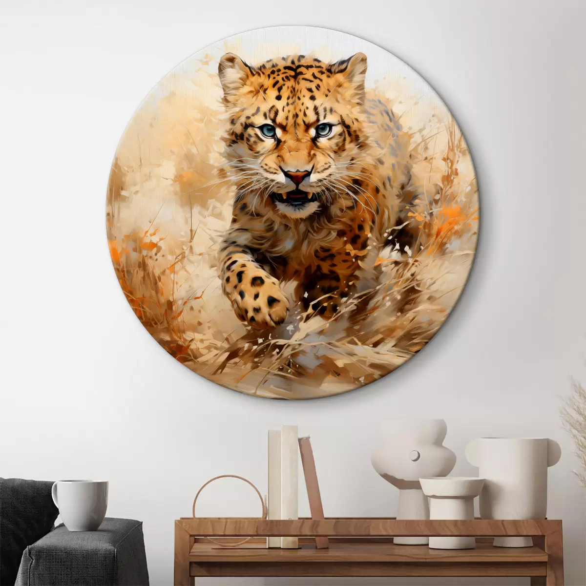 Ronde schilderijen Een cheetah met blauwe ogen en hoektanden zit in abstracte kunst met droog grasolieverfschilderij Nr r39182