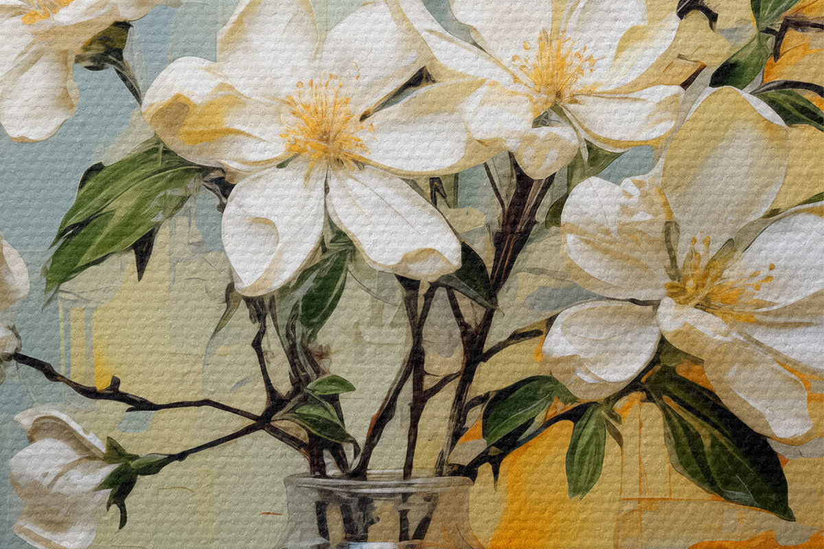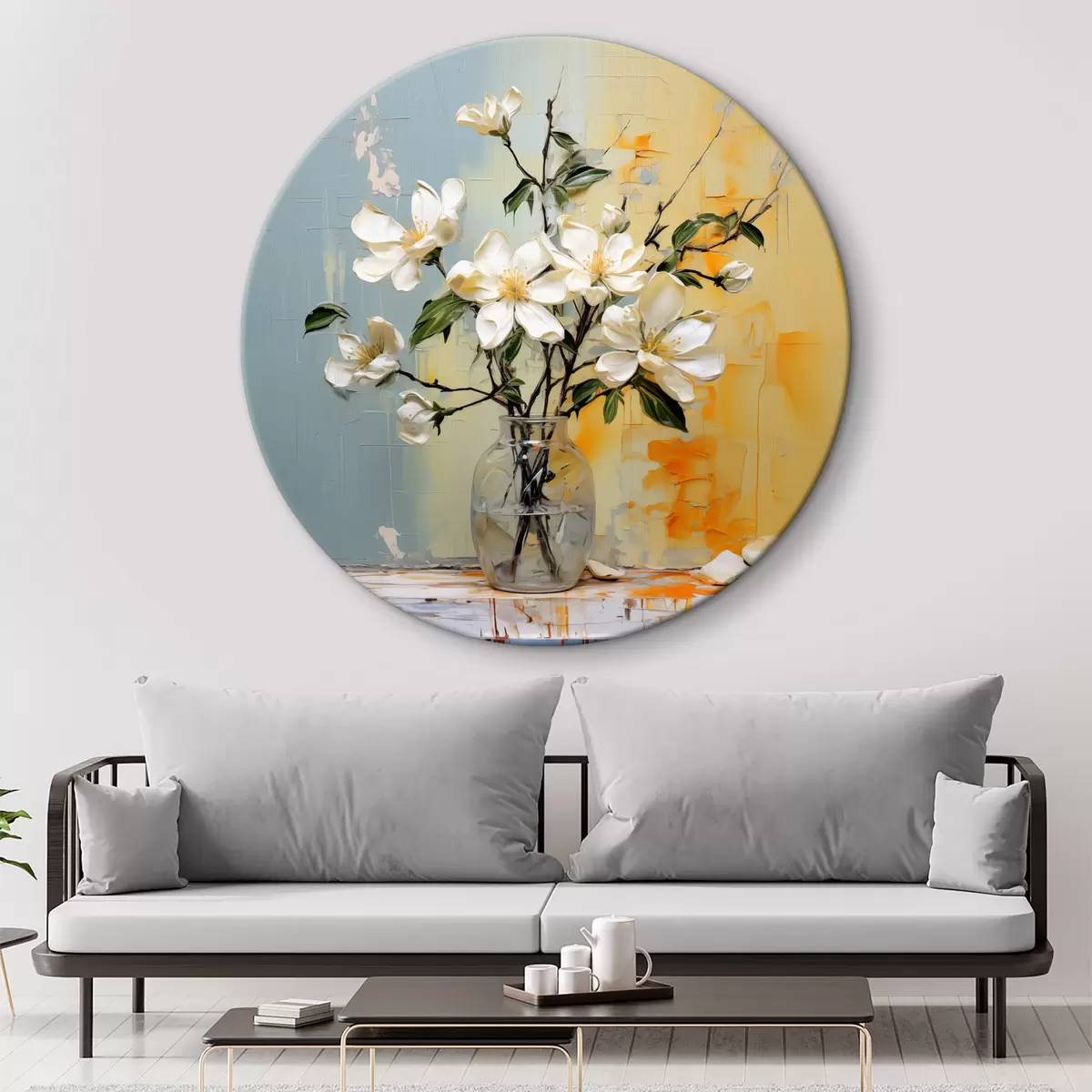 Ronde schilderijen Takjes met witte jasmijnbloemen in een glazen vaas olieverfschilderij abstracte kunst, blauwe en gele kleur r39183