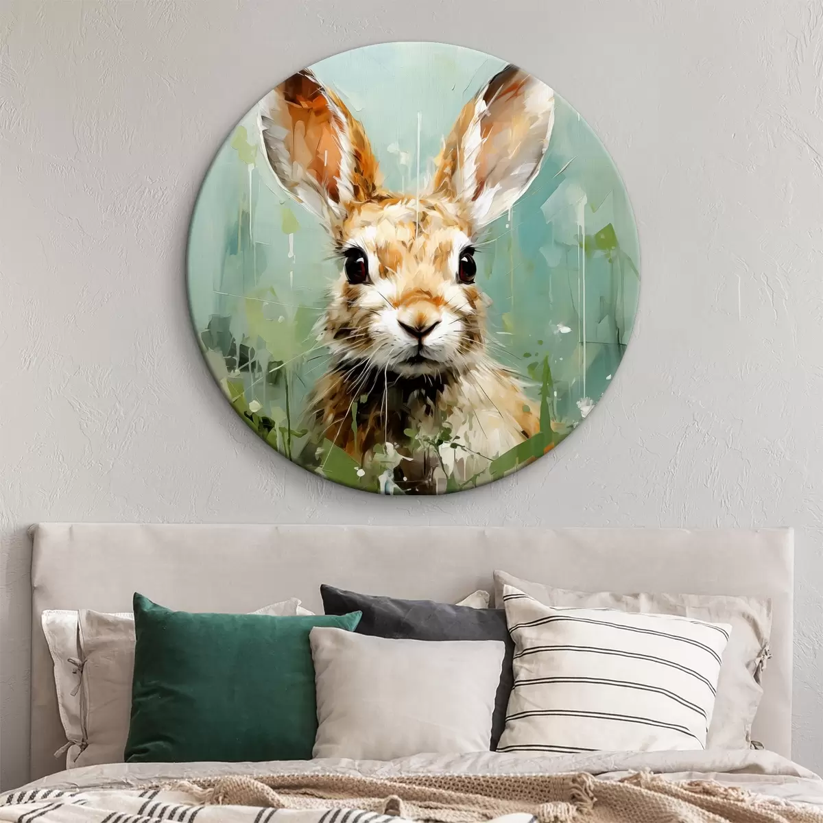 Ronde schilderijen Een rode haas zit in het gras op een groene achtergrond, olieverfschilderij abstracte kunst Nr r39184