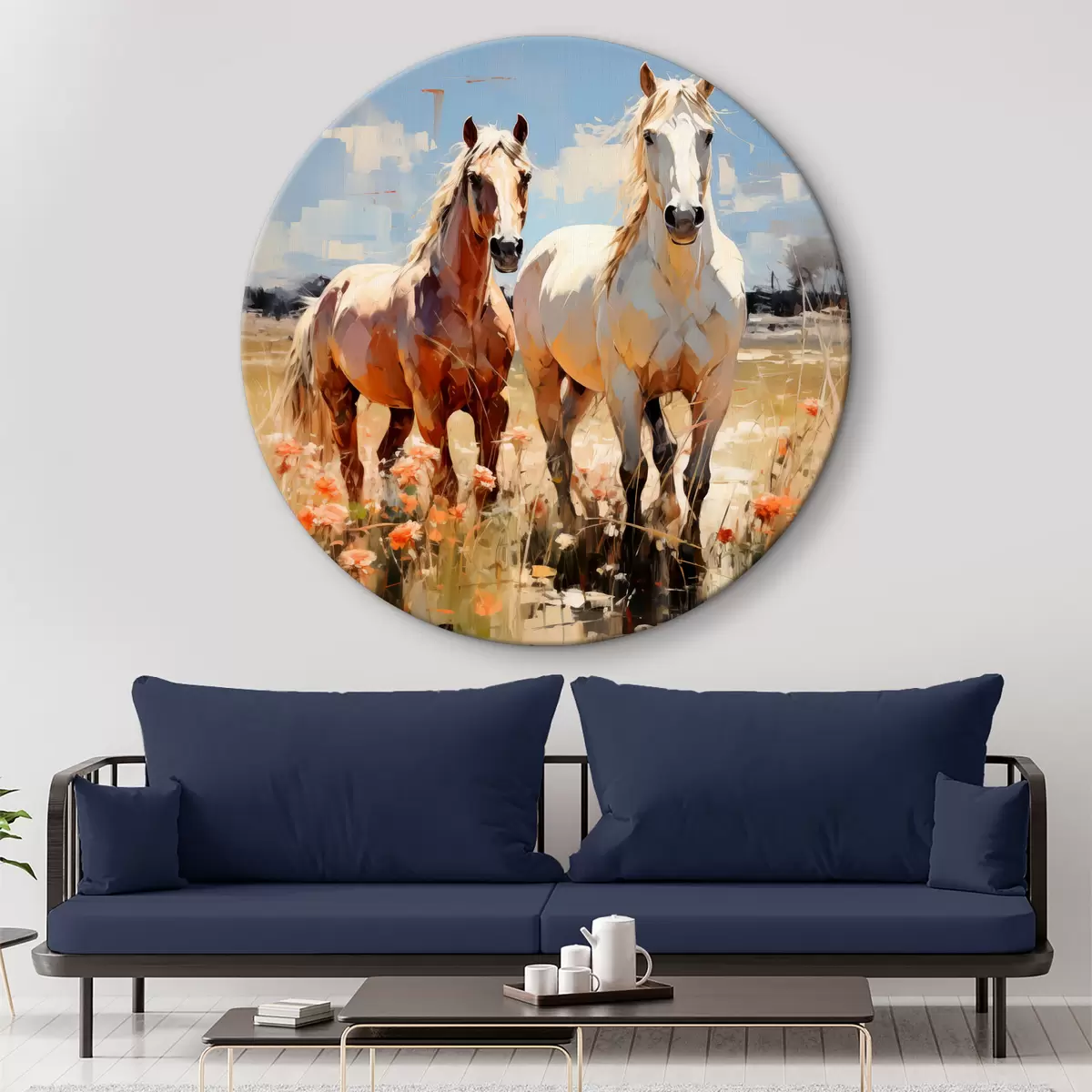 Ronde schilderijen Witte en bruine paarden grazen in een weide tussen wilde bloemen olieverfschilderij abstracte kunst r39187
