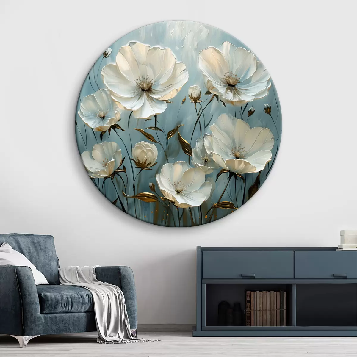 Ronde schilderijen Witte bloemen op blauwe achtergrond Nr r39246