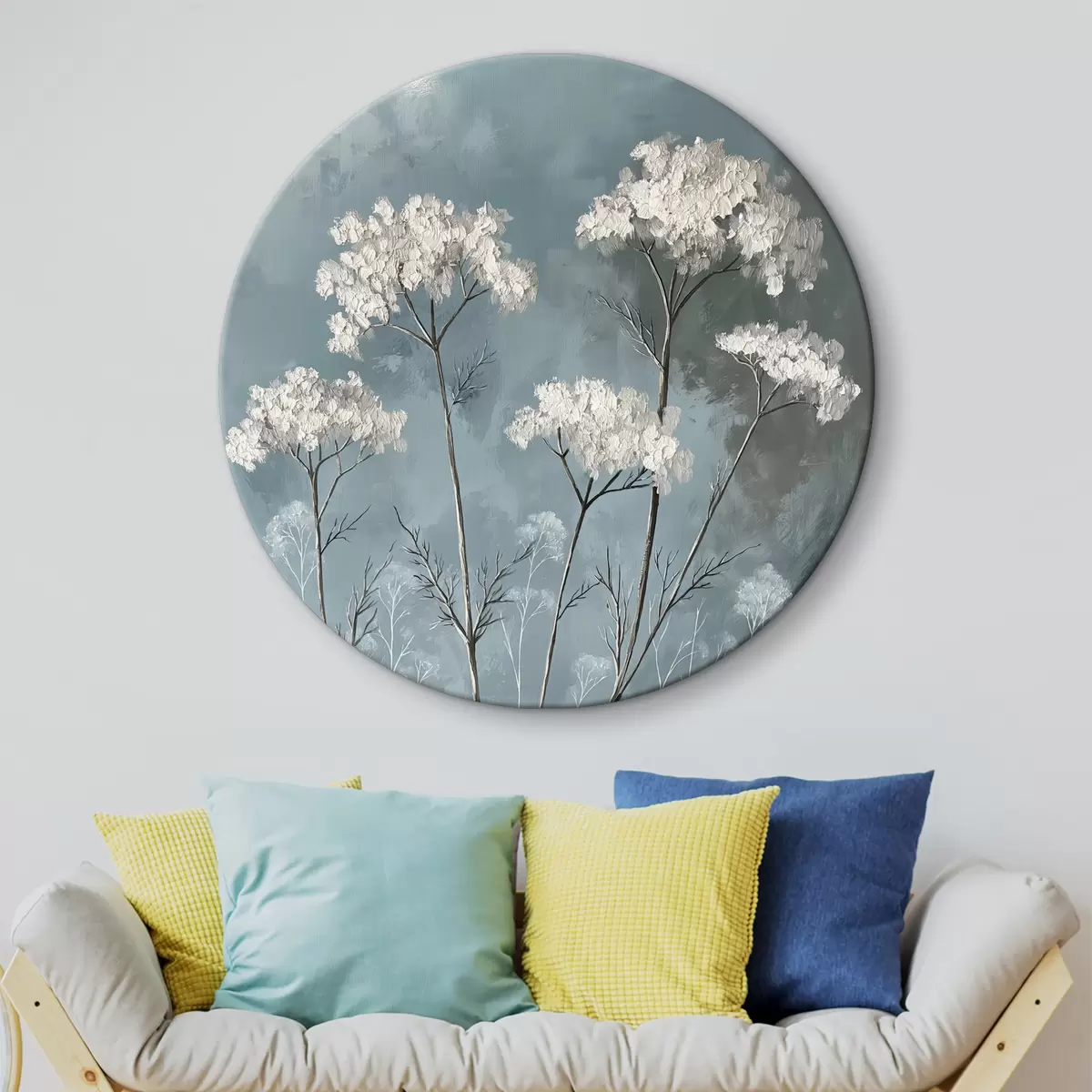 Ronde schilderijen olieverfschilderij van delicate witte bloemen op een blauwe achtergrond r39325