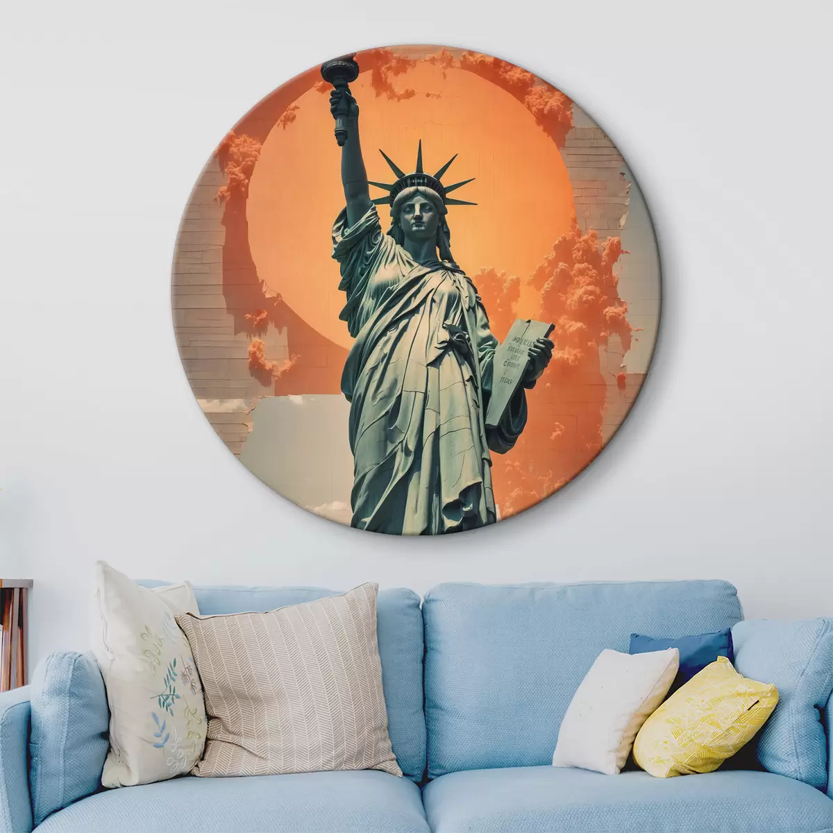 Ronde schilderijen Standbeeld van vrijheid op oranje zonachtergrond Nr r39377