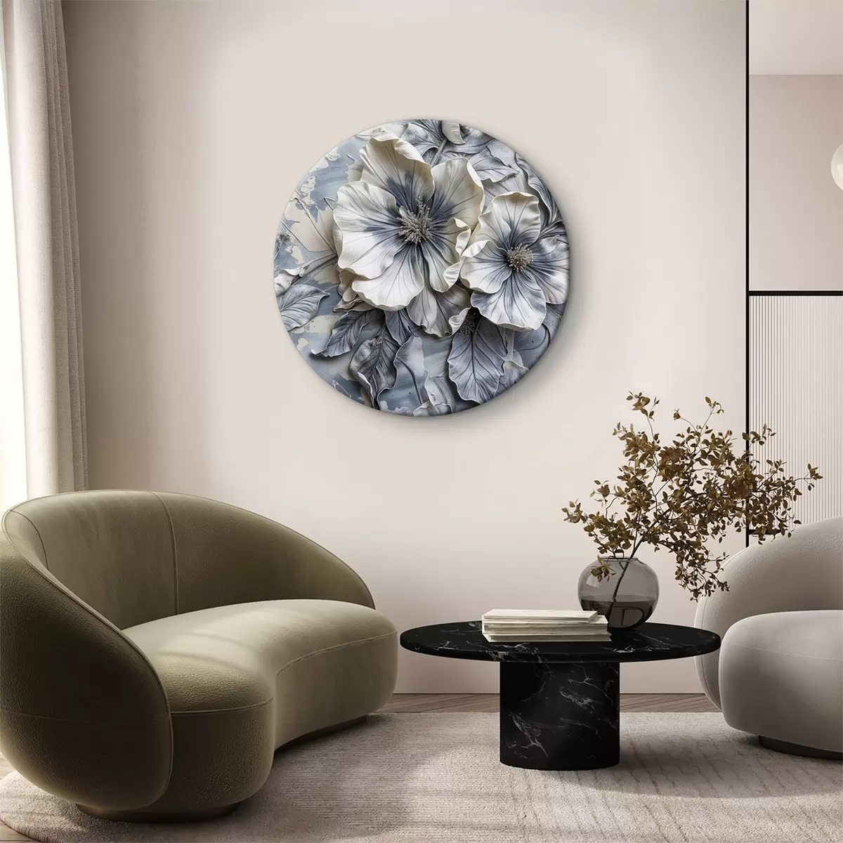 Ronde schilderijen Groot grijs en wit olieverfschilderij van bloemen met ingewikkelde details, tegen een zachte, onscherpe achtergrond Nr r39385