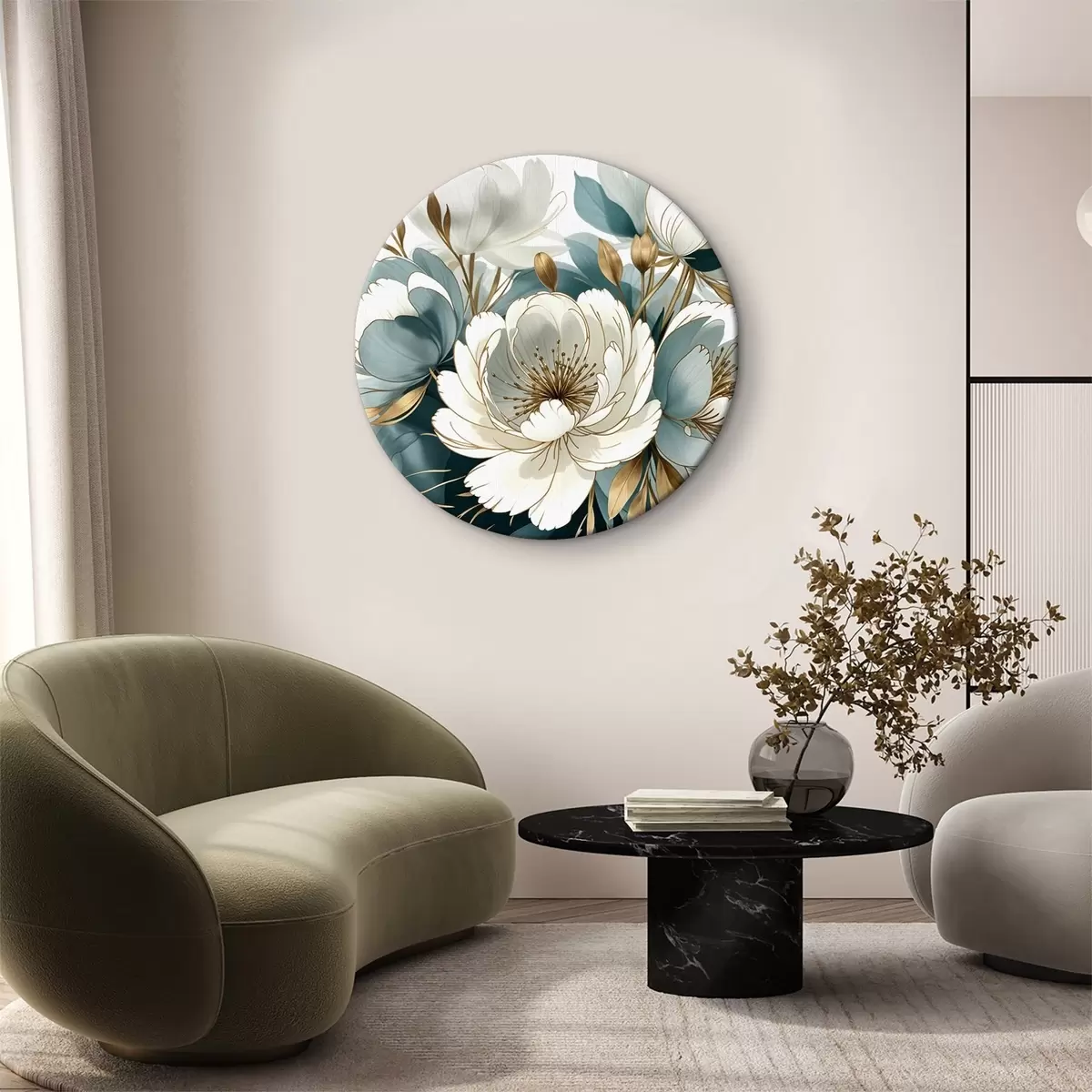 Ronde schilderijen Grote witte en blauwe bloemen met accenten, omringd door weelderig gebladerte r39389