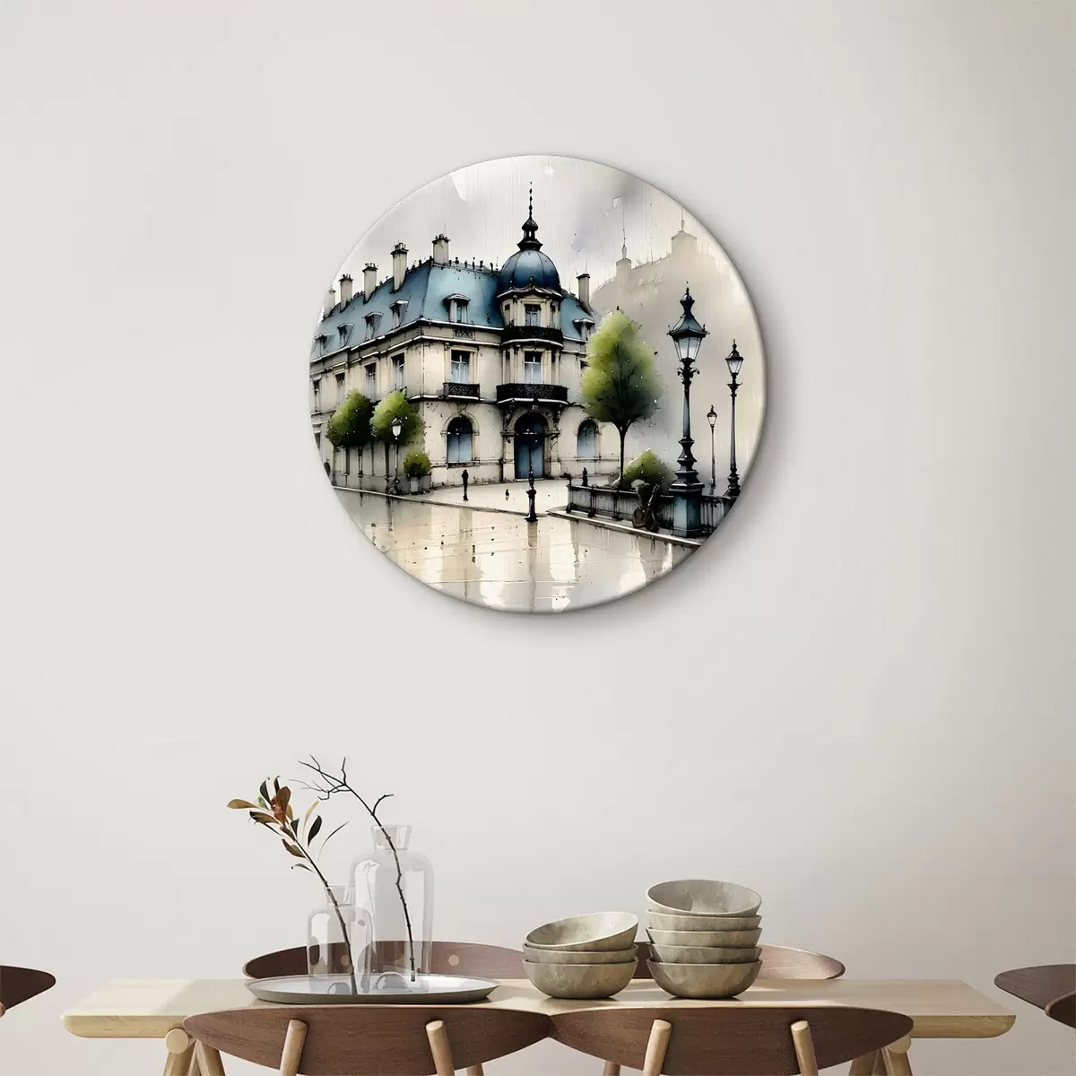 Ronde schilderijen Een groots gebouw met aquarelkunst omringd door lantaarnpalen en bomen, op een regenachtige dag Nr r39391