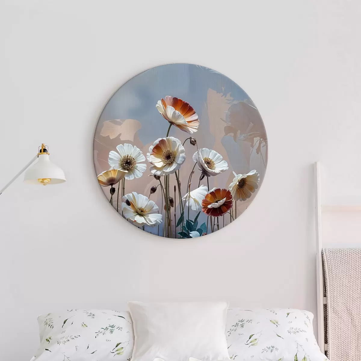 Ronde schilderijen Een veld met kleurrijke madeliefjesbloemen met witte bloemblaadjes en oranje middelpunten tegen een zachte, onscherpe achtergrond Nr r39396